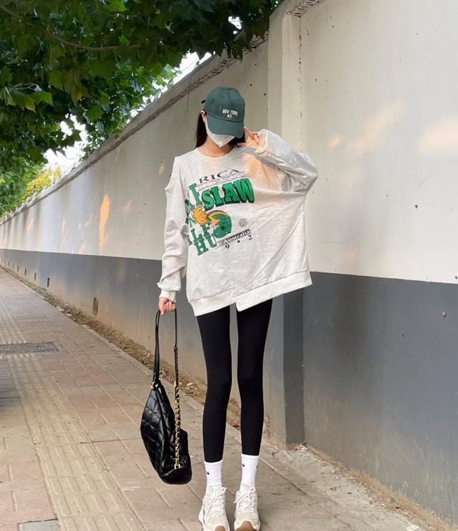 簡直就是春秋季節的標配穿搭,衛衣+鯊魚褲太絕了,這麼一整套看起來簡簡單單的就很舒服。休閒衛衣版型是寬寬大大的,很藏肉顯瘦。黑色鯊魚褲穿起來也超級舒服的,非常百搭和顯瘦。