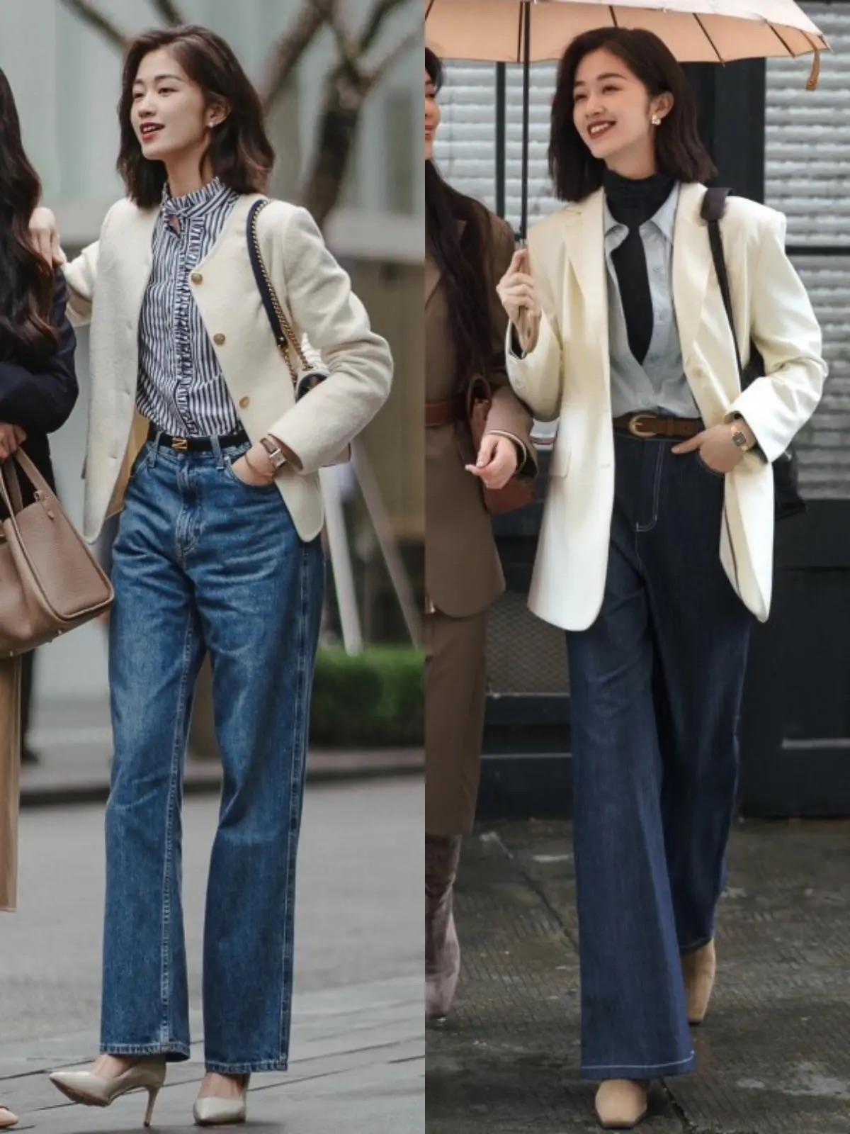用白色西服外套來疊搭襯衫、半高領的打底衫,層次清晰又更加耐看。白色西服外套,配上高腰的直筒牛仔褲,簡簡單單、時髦度也更強,利落且精緻。