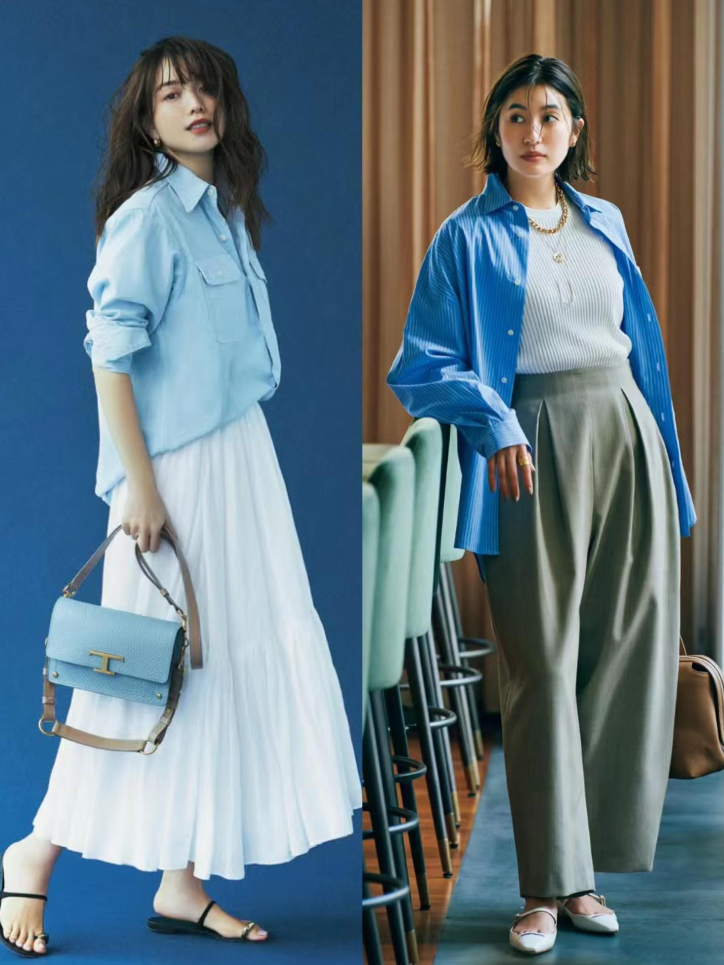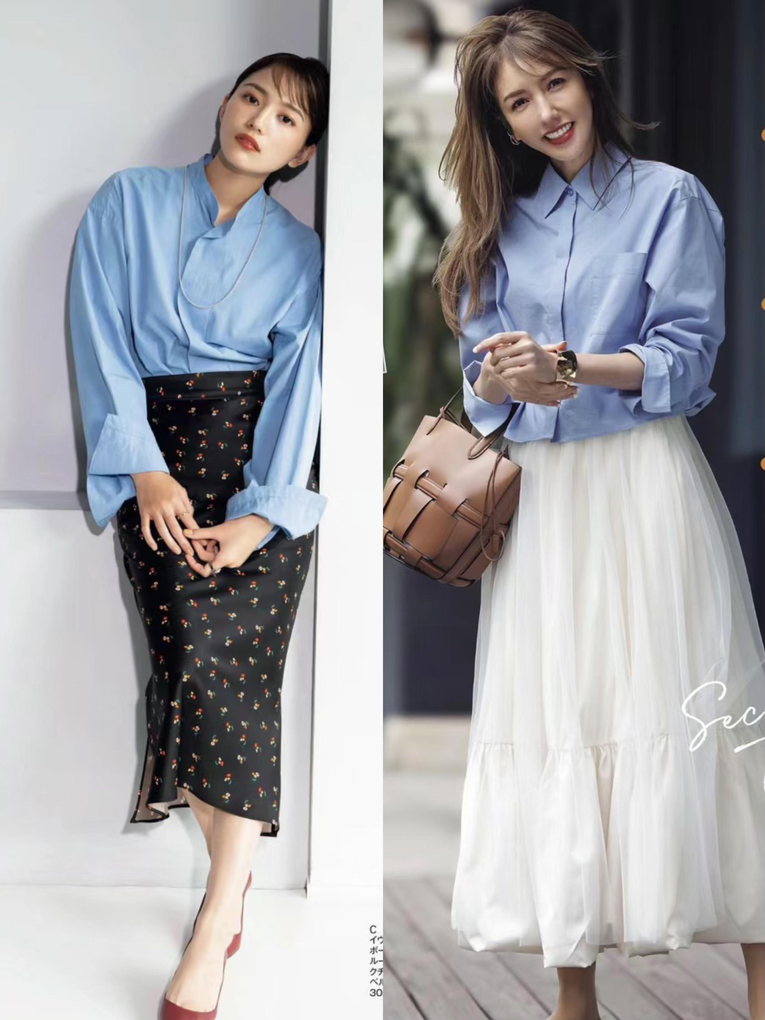 藍色襯衫乾淨、大方,穿起來更加時尚顯白。我們可以用藍色襯衫來搭配高腰的半身裙,表現出更溫柔的力量。藍色襯衫配魚尾半身裙,彰顯身材的豐腴美。