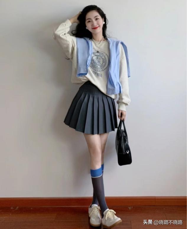 短款百褶裙的穿搭不建議遮過膝蓋,因爲我們爲了方便搭配短襪,就可以很好的去延展腿型的長度,穿運動鞋也不在話下,減齡時尚感很強,回頭率很高。