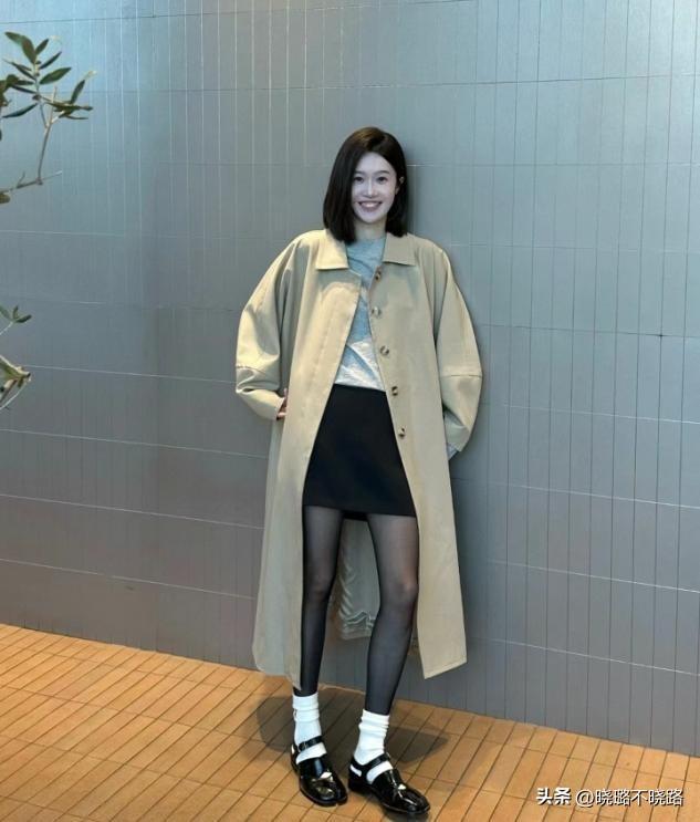 黑絲的穿搭,如果想要降低那一些成熟年齡感,我們可以利用搭配短襪和皮鞋的穿法,在優化你腿型的同時,利用長款的風衣來縮減身材側面的寬度,更好的發揮你的腿長特點。