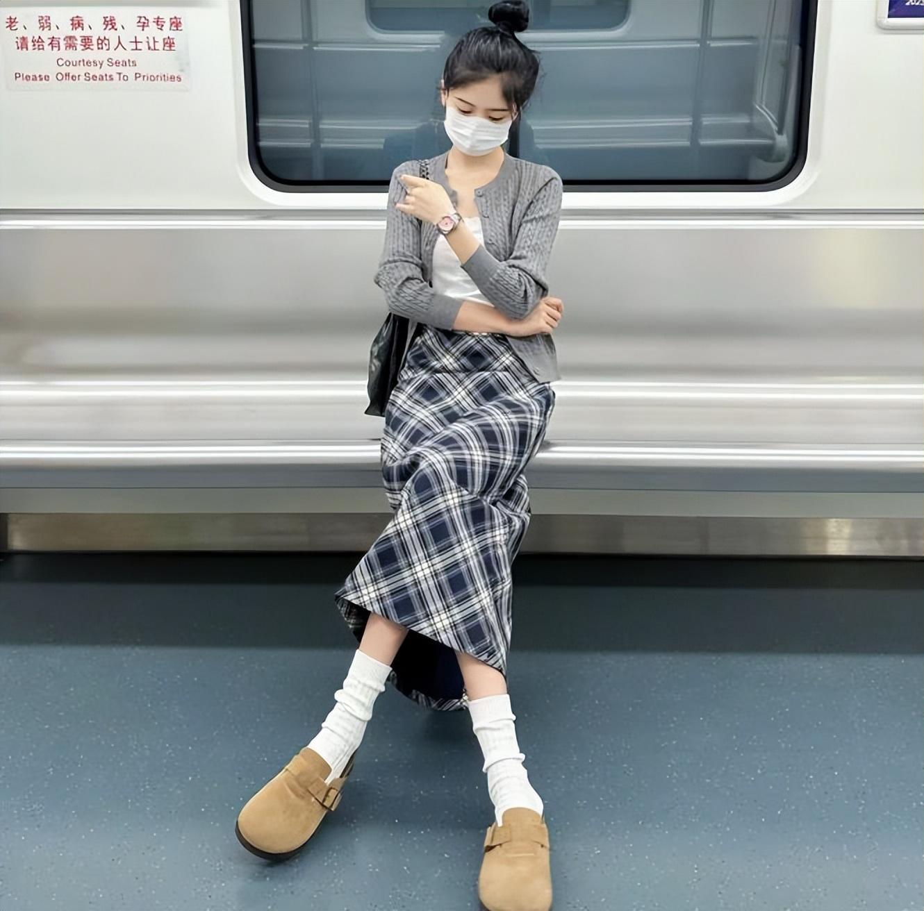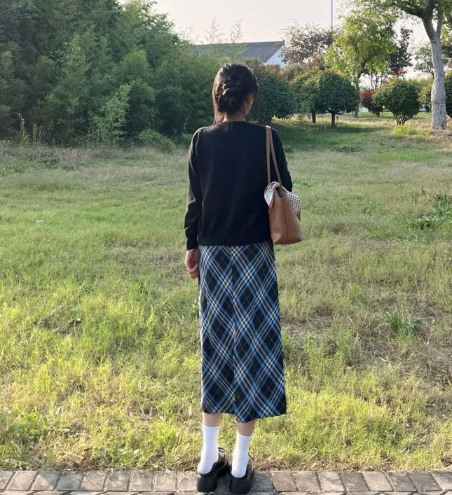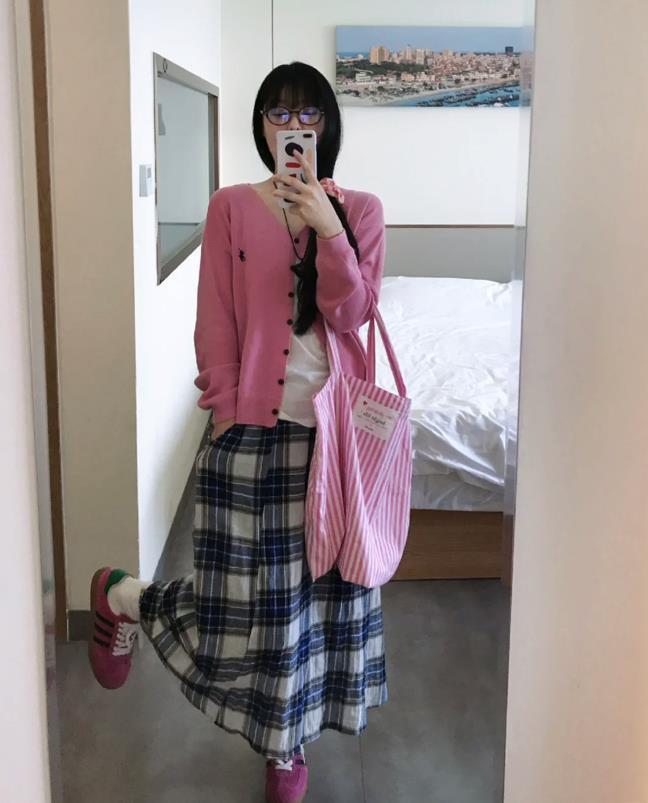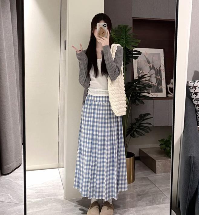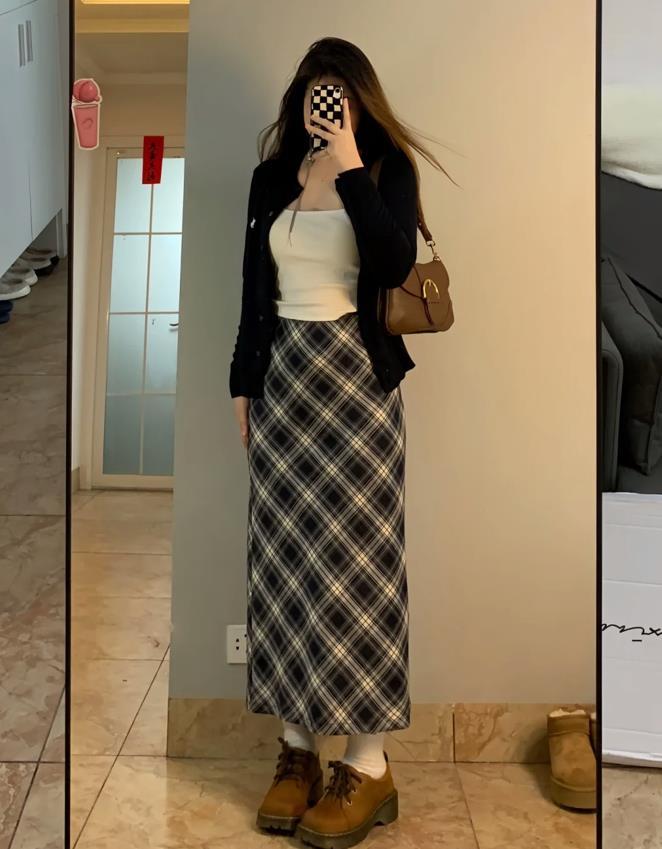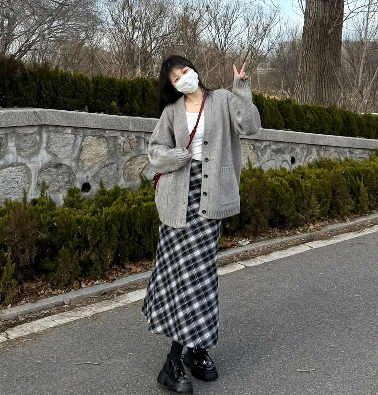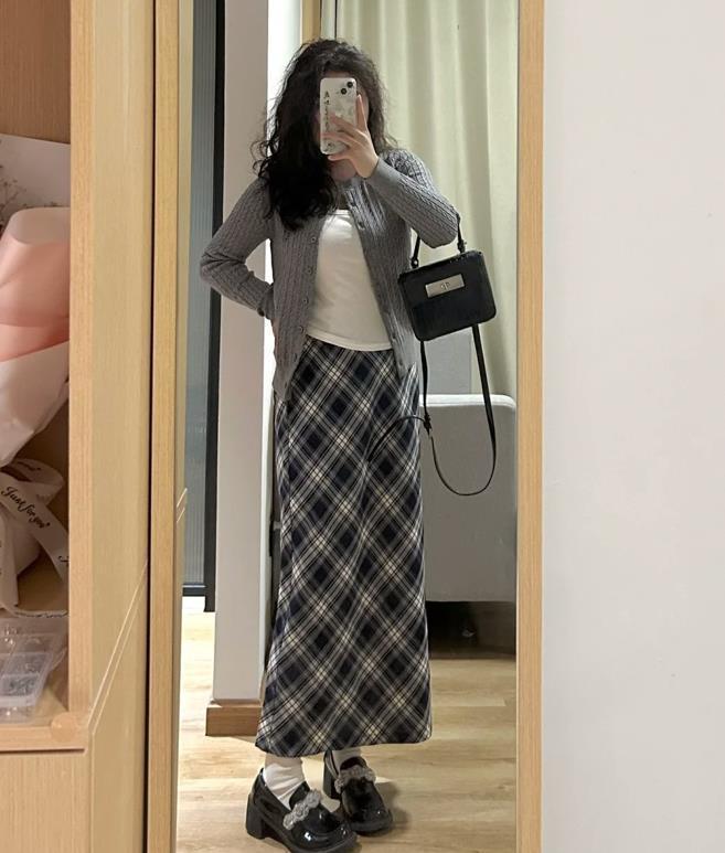 骨架小的身材,可以借鑑下這套,有些修身版型的針織開衫,穿起來就很好修飾身材,選擇格紋半身長裙相配,直筒版型,能隱藏起下身的缺點。