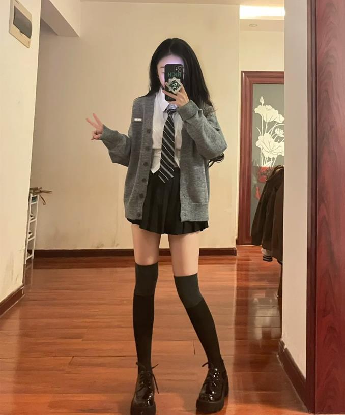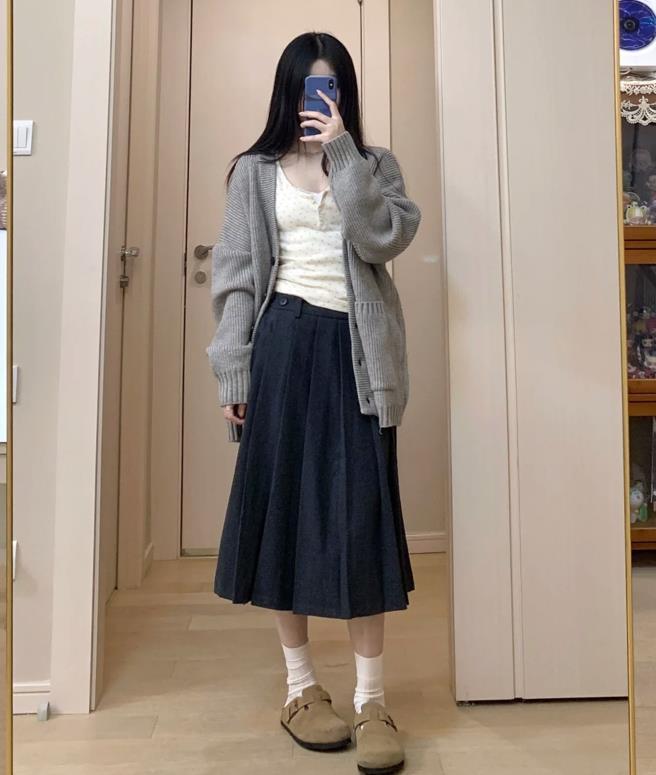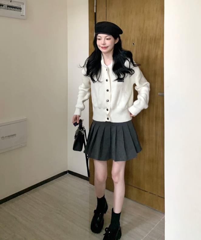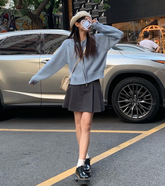 春天一定要有一件灰色的針織開衫,溫柔氣質又很百搭,整件看起來很乖的,也帶着幾分書卷氣,搭配灰色百褶短裙,乾淨利落。