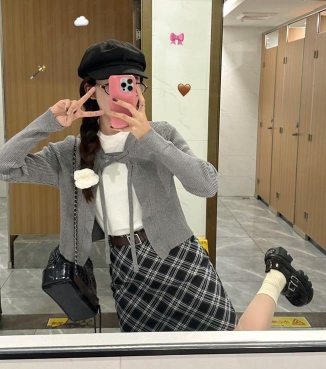 這種小開衫,真的是很適合個矮的姐妹們,高級灰的配色,百搭不說,最重要的是耐看,選擇格紋半身直筒長裙來配,一點都不壓個子。只要提高腰線比例就行,顯瘦效果超讚的。