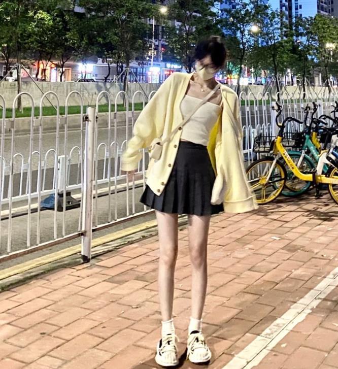 開衫與百褶裙的搭配,也太學院風了吧?奶黃色調的開衫,看着就很溫柔,最重要的是能把膚色襯托得很白皙。結合百褶短裙相配,大長腿就打造了。