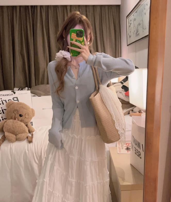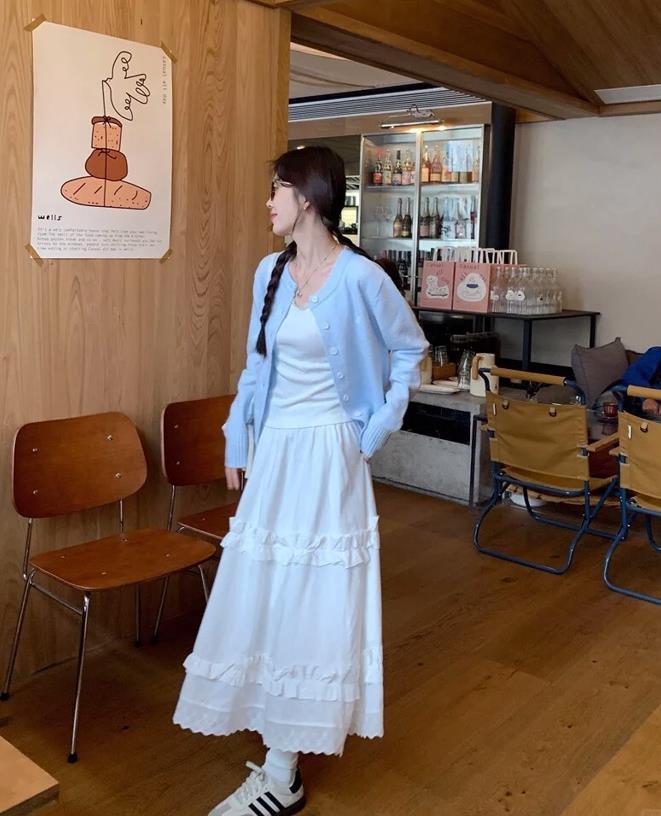 這套的配色也太好看了吧,清新的藍白,是怎麼看都不覺得膩,很適合溫度不是那麼低的春季,蕾絲吊帶+蛋糕白色半裙+奶藍色針織開衫,又軟又仙氣,妥妥的小仙女造型。