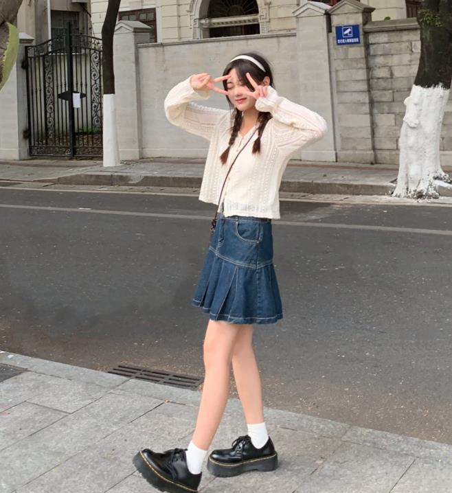 很適合春夏季節的穿搭,鏤空材質的針織開衫,可以單穿,也可以在裏面疊穿一件小背心吊帶之類,搭配牛仔百褶短裙,好顯高啊,少女範十足的穿搭。