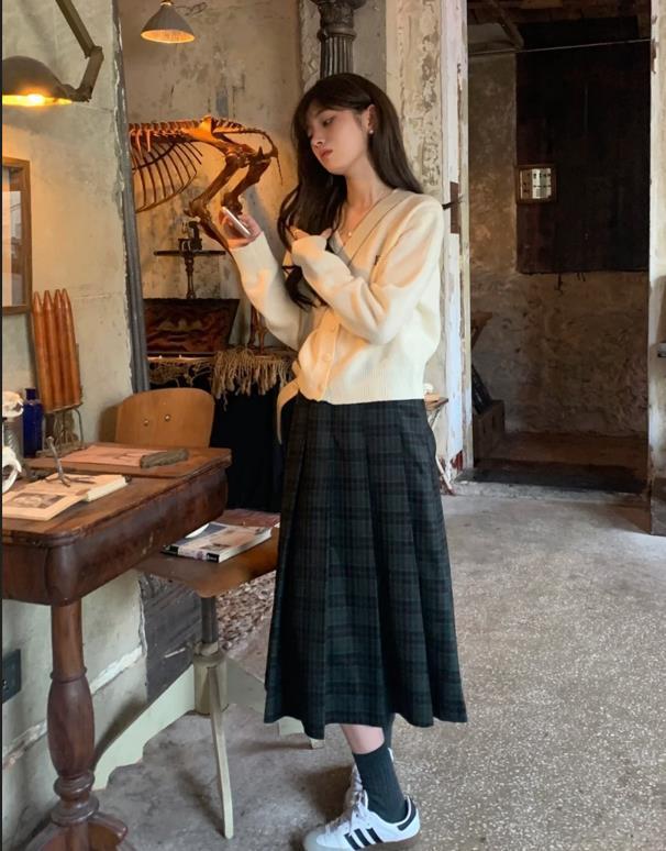 這套真的又乖又溫柔,羊毛開衫穿起來柔軟舒適,奶白的顏色超級溫柔的,也很不挑膚色。選擇綠棕色格紋裙,一下子就打造出北歐的感覺。