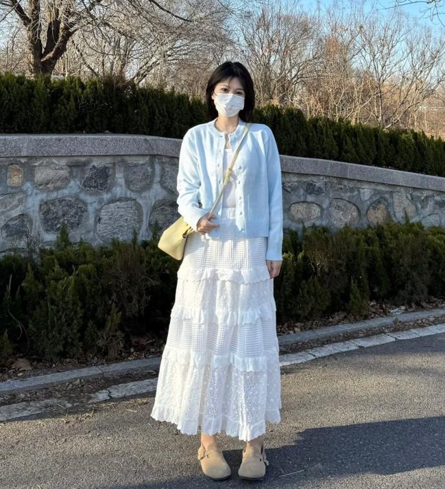 喜歡淺藍,也喜歡乾淨的白色,當這兩種顏色組合在一起,撲面而來的就是清新感了。溫柔又不失少女範,小短款的針織開衫,即使與半身長裙搭配,也不會壓低個子,反而是能輕鬆打造出高挑感。