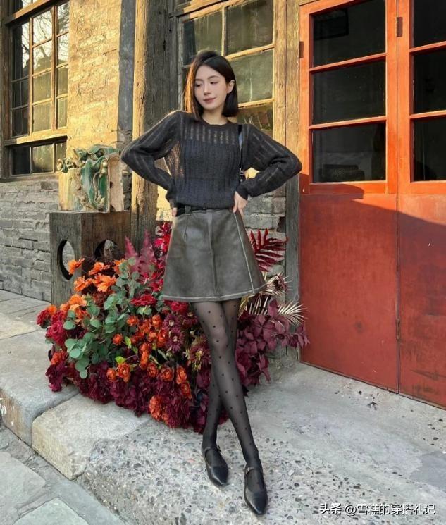 皮質短裙的着裝優越性也特別明顯,我們用純黑色或者褐色來展示格調,上衣選用修身款式的針織衫來拉扯曲線感,這種美麗和大方的成熟性感韻味,匹配上黑絲,可以讓風格的優勢翻倍。