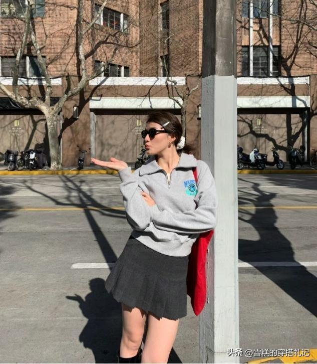 百褶裙的穿法跨越了很多年齡階段的穿搭,就以衛衣搭配百褶裙的組合來看,這種大輪廓的上衣穿法更容易展示出減齡顯嫩的一面。詮釋出造型寬窄輪廓的對稱效果,穿長筒靴就更顯身材的縱向比例感。