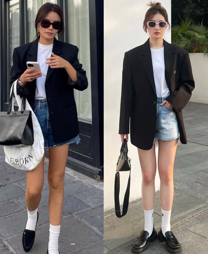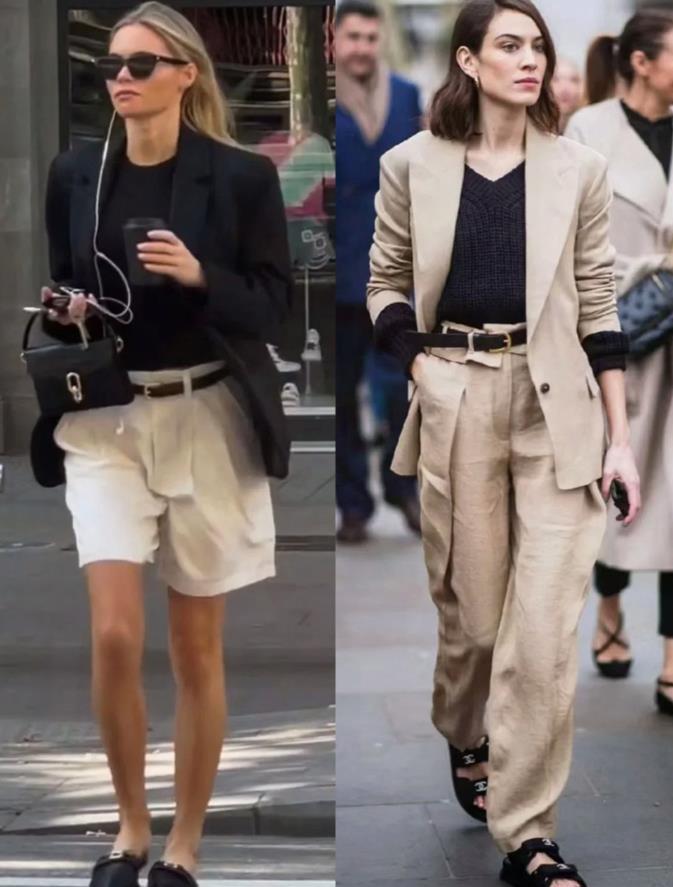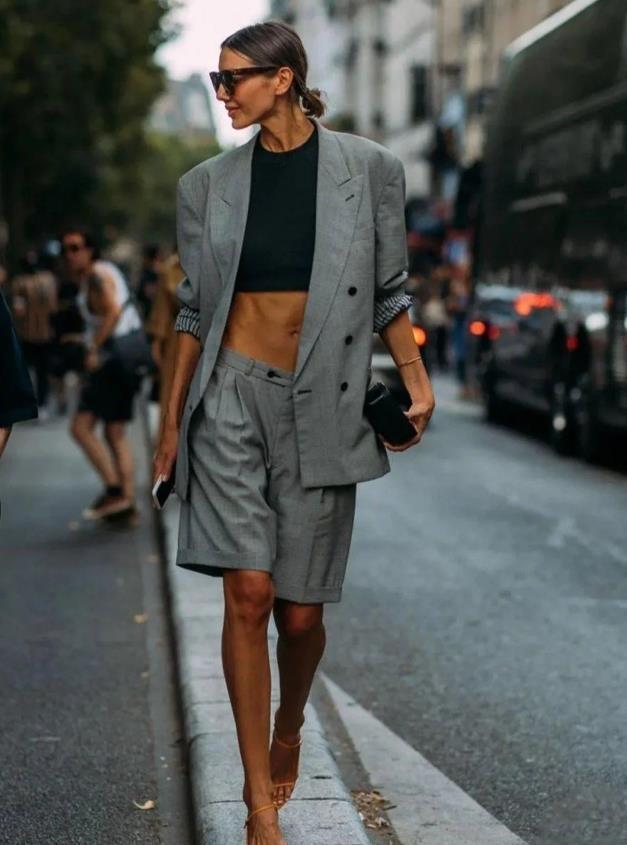 還有西裝外套配短褲,這種穿搭效果主打一個顯高挑和腿長,整體風格有些休閒。