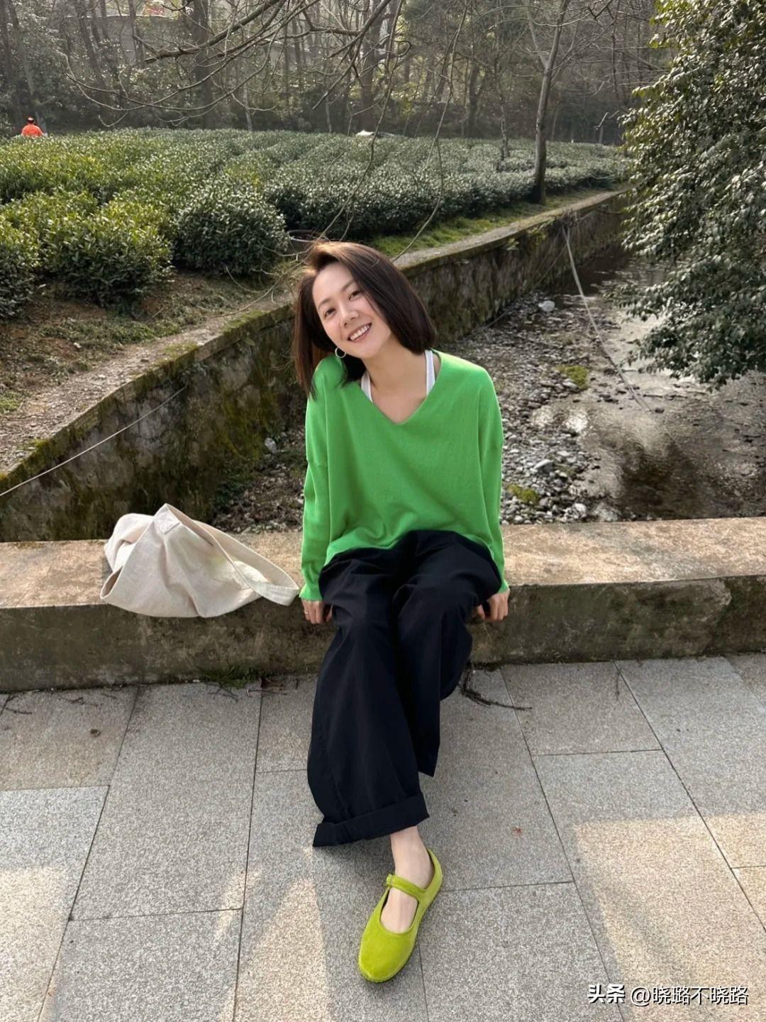 @穿搭展示:綠色毛衣+闊腿褲+淺綠色奶奶鞋