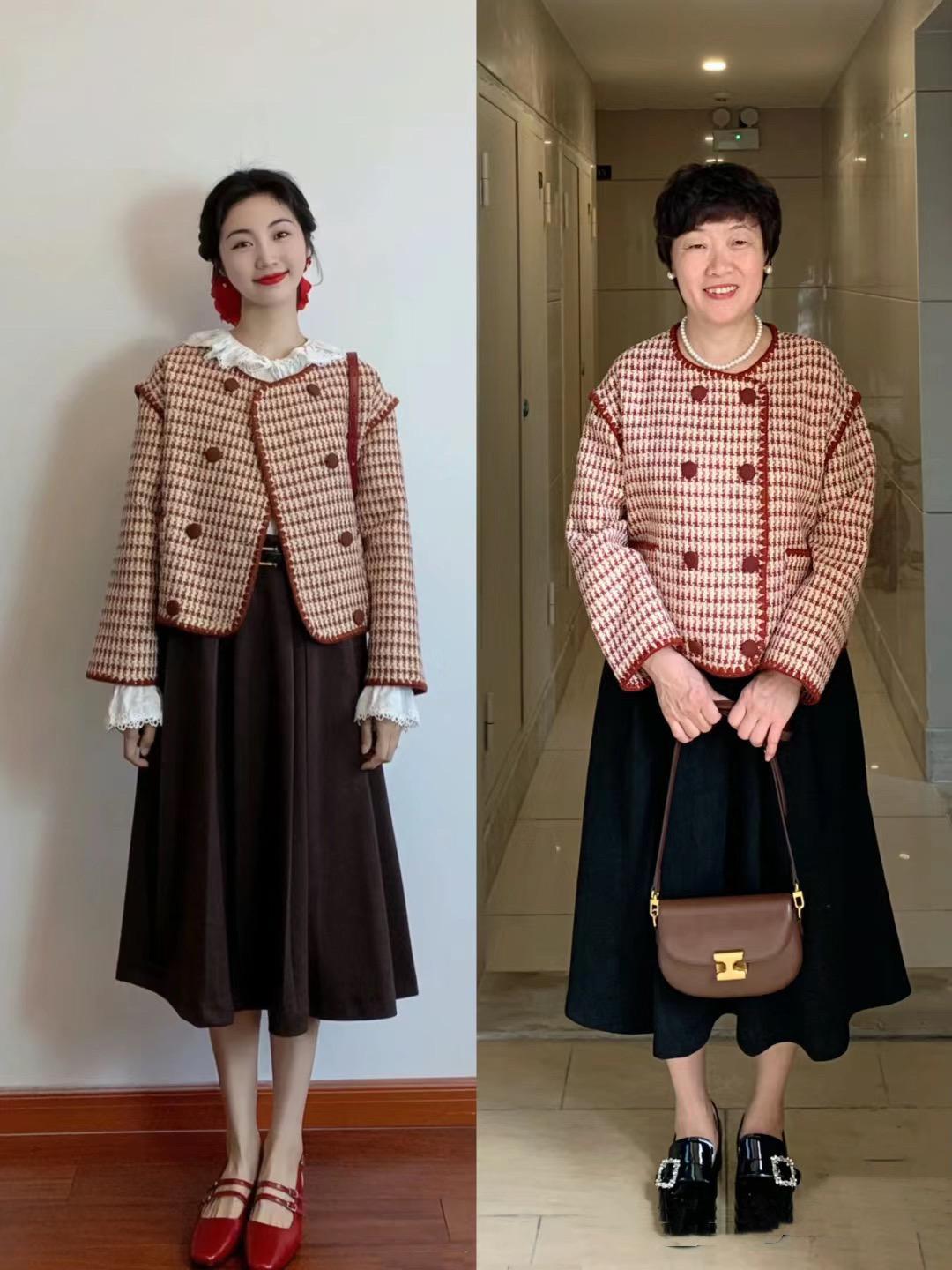 博主的穿搭偏向甜美一點,以小香風外套疊搭蕾絲邊的白襯衫展現俏皮柔和。這位阿姨的穿搭,則更突顯貴氣。在小香風外套的基礎上,疊搭珍珠項鍊、展現中年女人的優雅端莊。