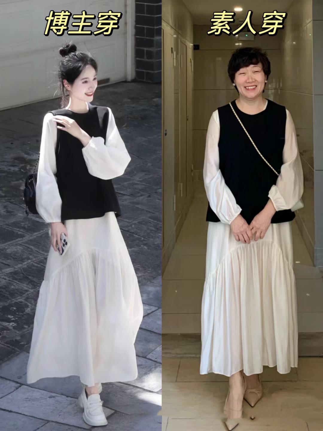 阿姨在這組穿搭的基礎上,稍微做了一點改進。白色連衣裙配黑色馬甲,將厚底樂福鞋換成了尖頭的高跟鞋。尖頭高跟鞋更利於女性氣質的呈現,可以修飾雙腿線條、表現出身材的挺拔美。