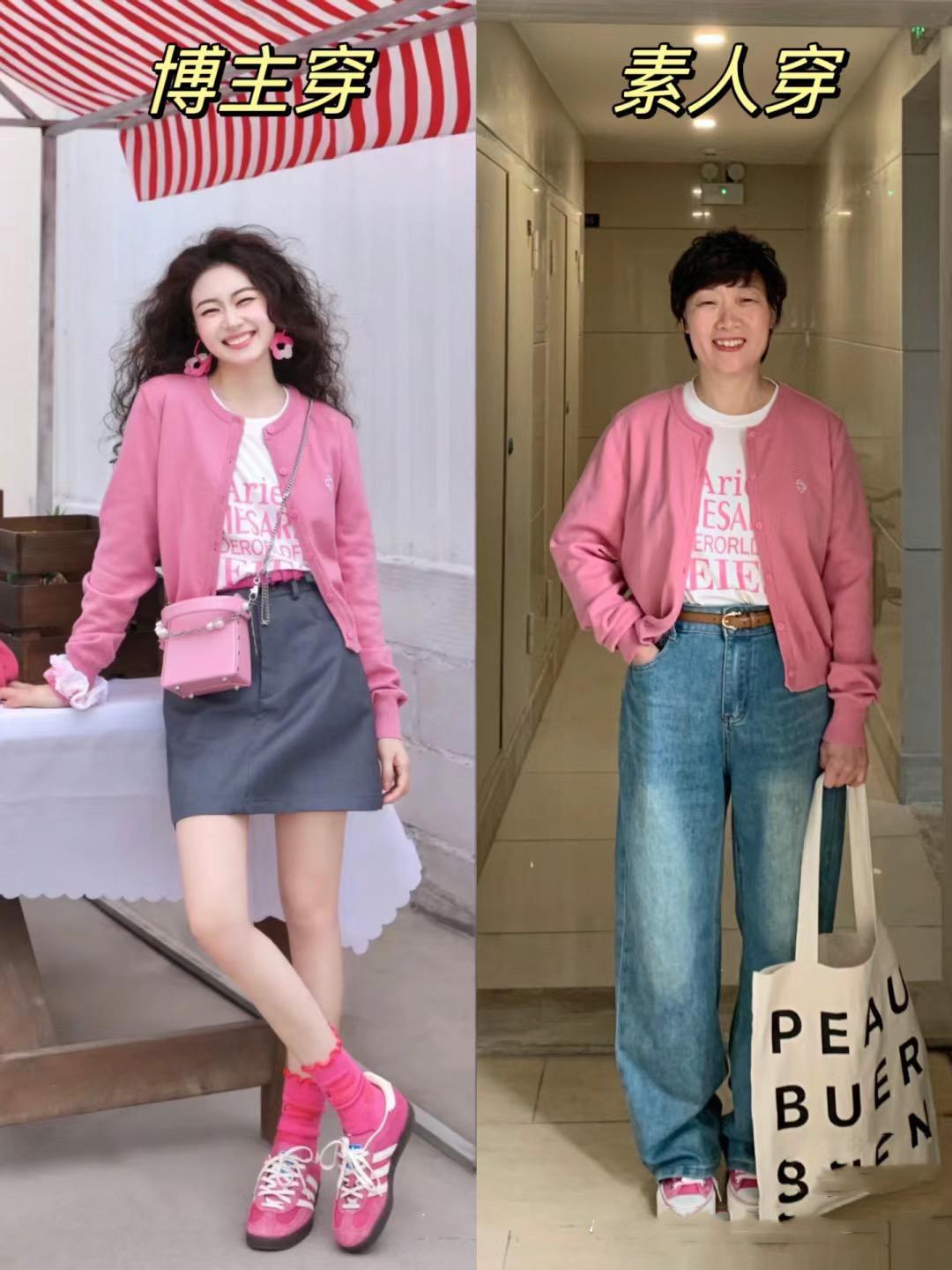粉色針織開衫,直接配白色印花T恤,清新顯白還很甜美。將超短裙換成了高腰的直筒牛仔褲、簡簡單單的搭配就體面減齡,直筒牛仔褲寬鬆的版型也可以修飾中年體型。