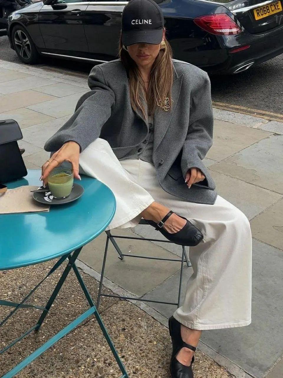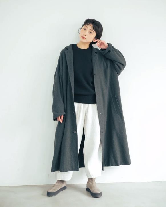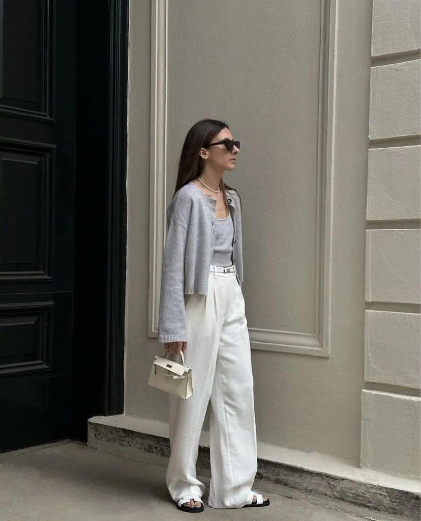 灰色和咖色一樣,這兩種顏色任意一種與白褲子搭配,都能打造出高級感。中性的配色,看起來也舒服。