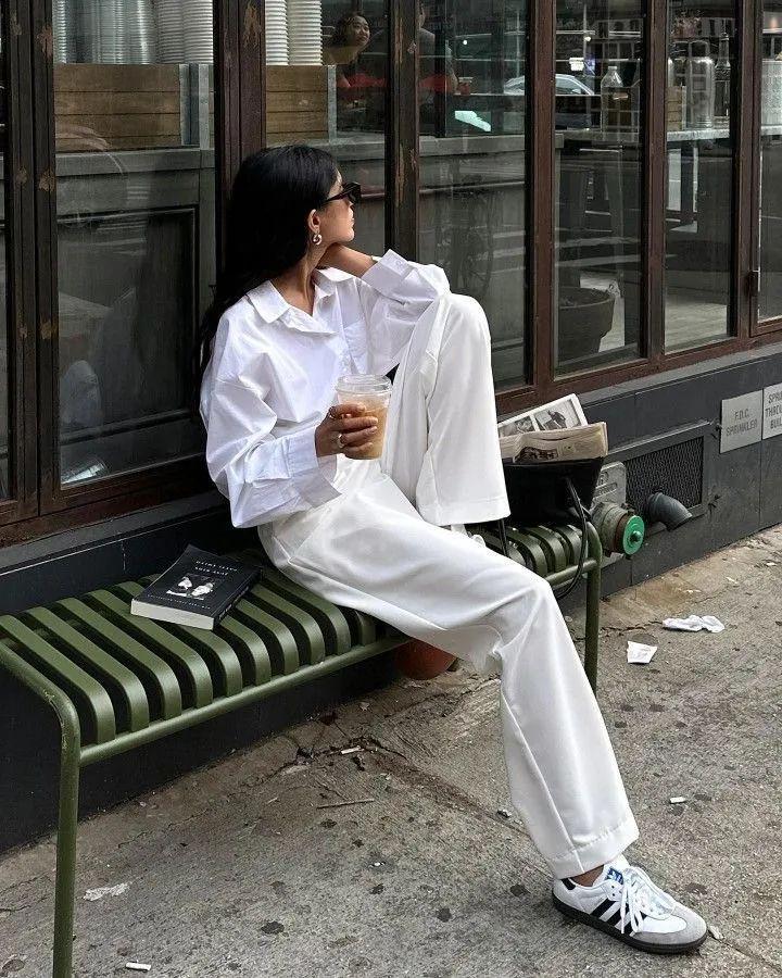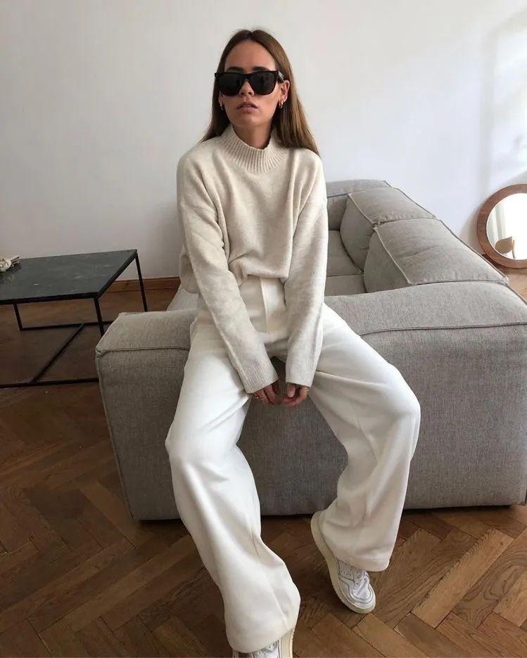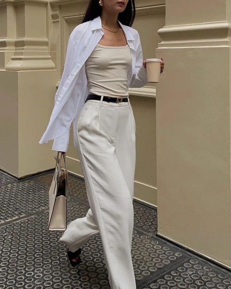 上下裝顏色一致的白色系組合,可以是奶油白,也可以是亮白色,喜歡追求簡單風格的姐妹就肯定會這麼穿。