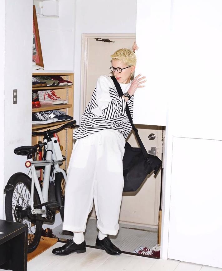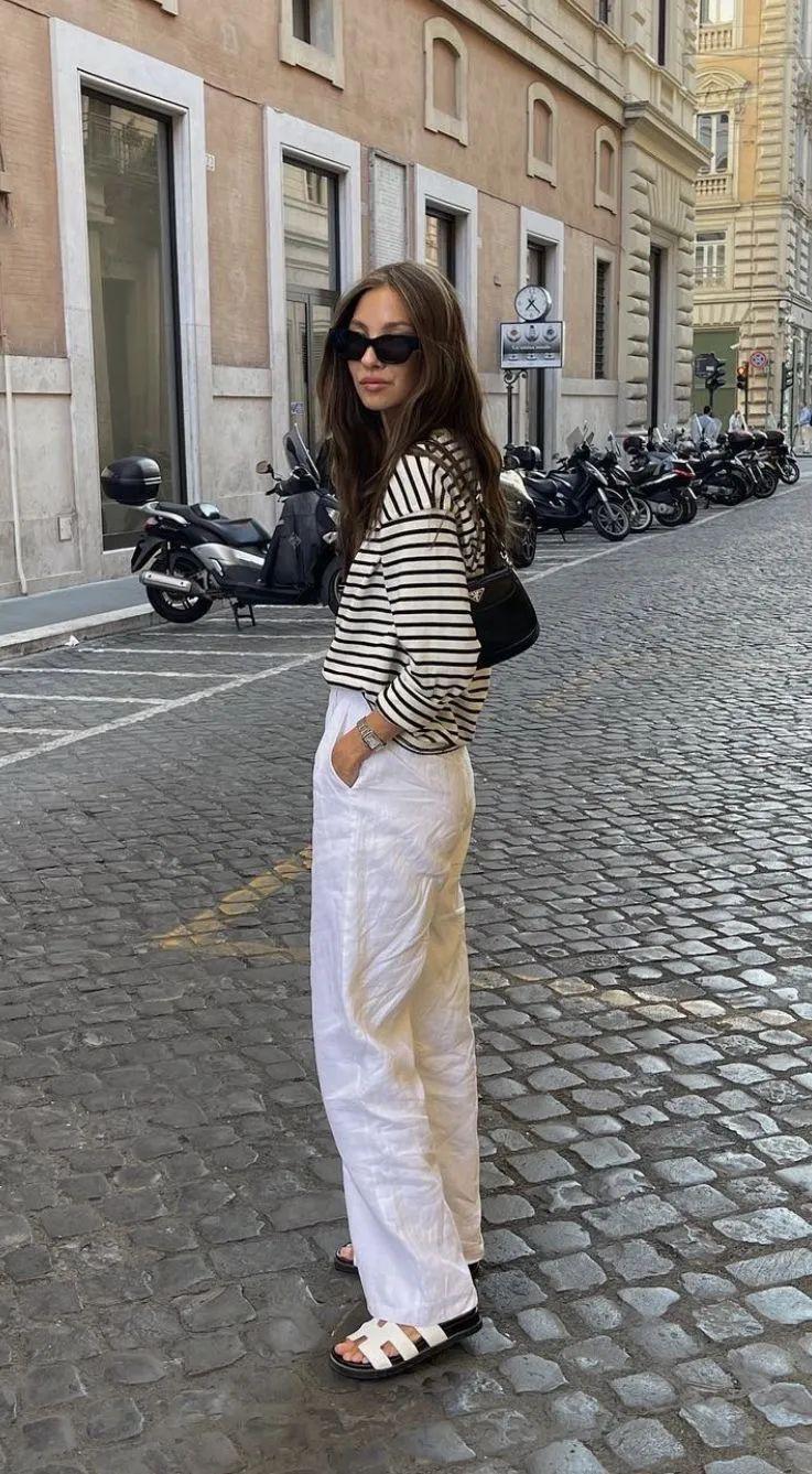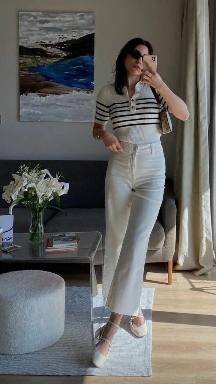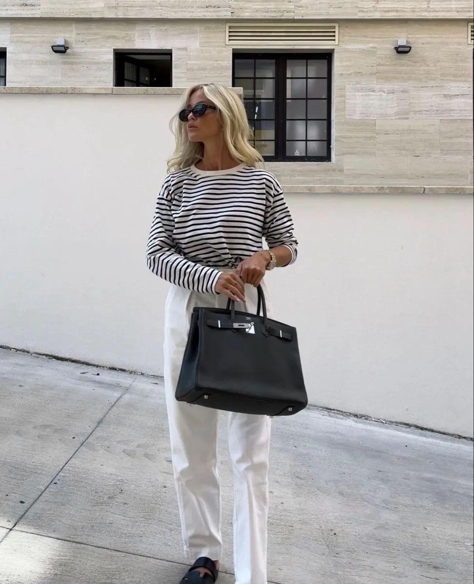 還有頗顯休閒風的條紋t恤,搭配白色長褲,這也是比較適合日常街頭的隨意穿搭,想要打造出時髦精緻感,多少還的加入一些配飾點綴。