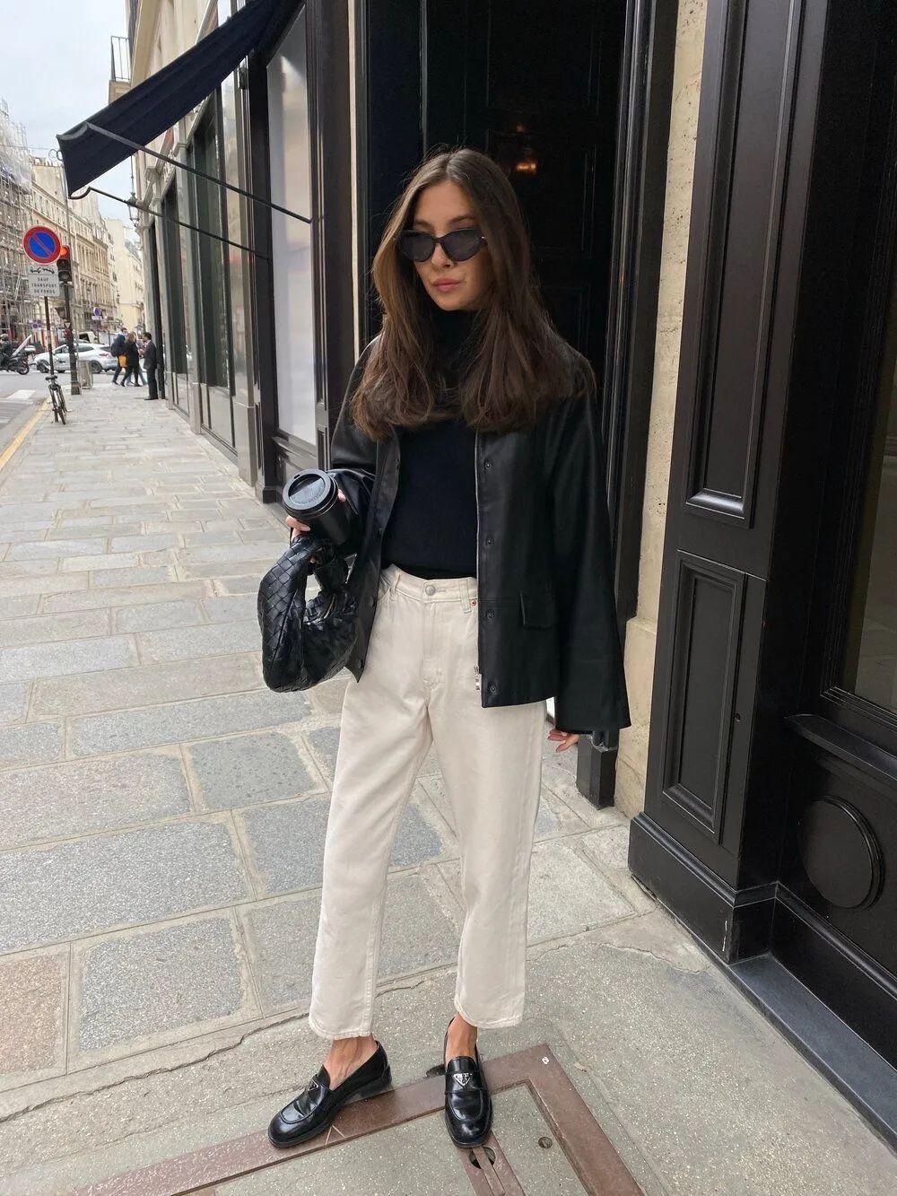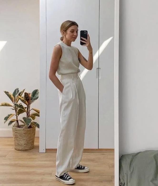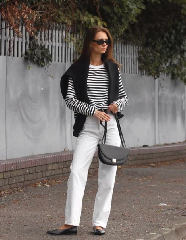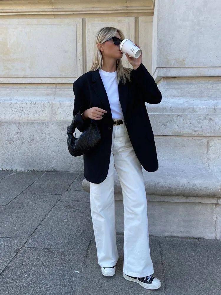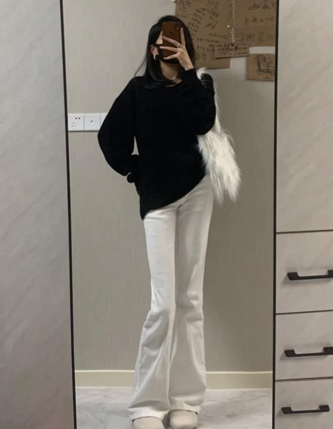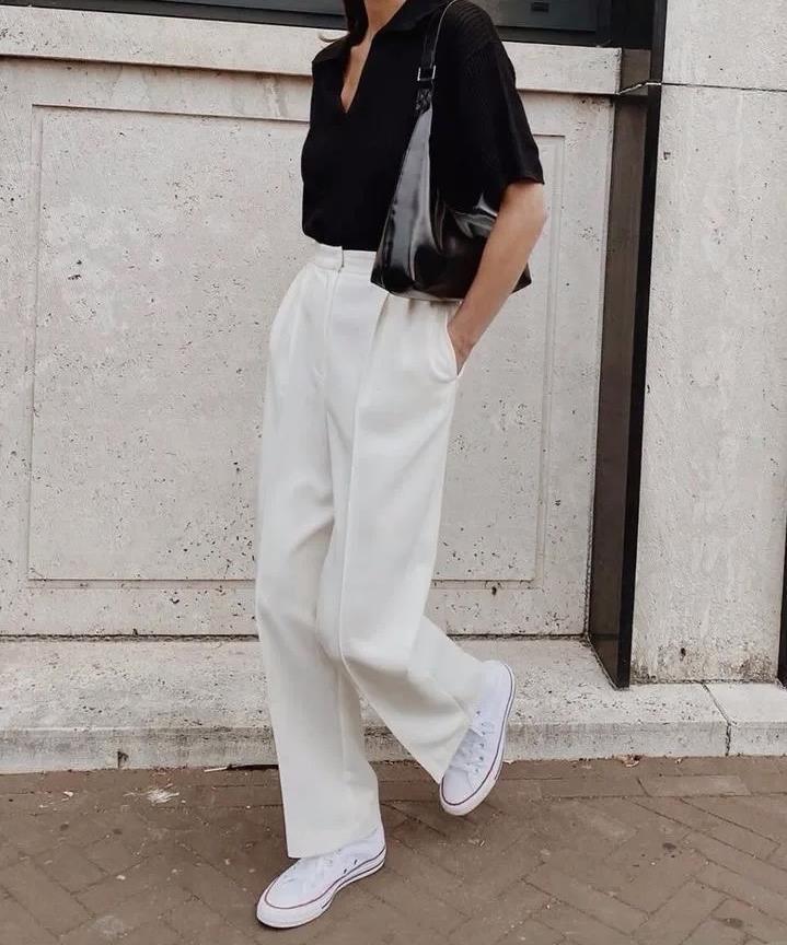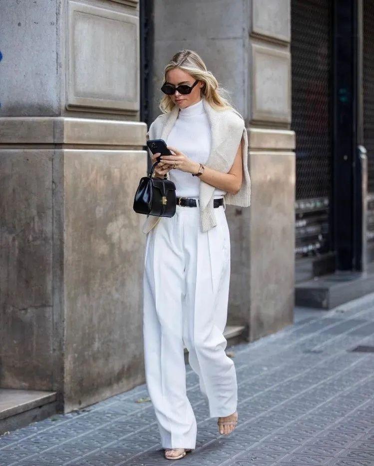 喜歡冷淡風穿搭的姐妹,白色長褲最好選擇黑色上衣來配,春天裏黑色打底或針織、衛衣都能與白褲子打造出這種風格。