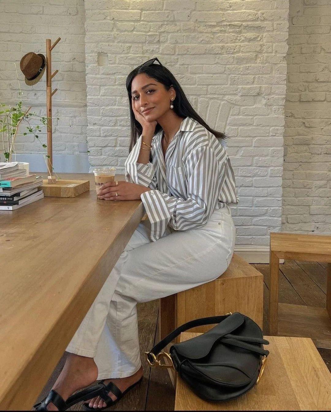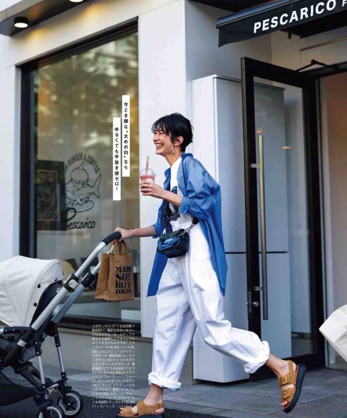 條紋襯衫和白褲子的搭配,也能給人一種比較輕熟風的既視感,非常適合上班通勤的女性們穿。