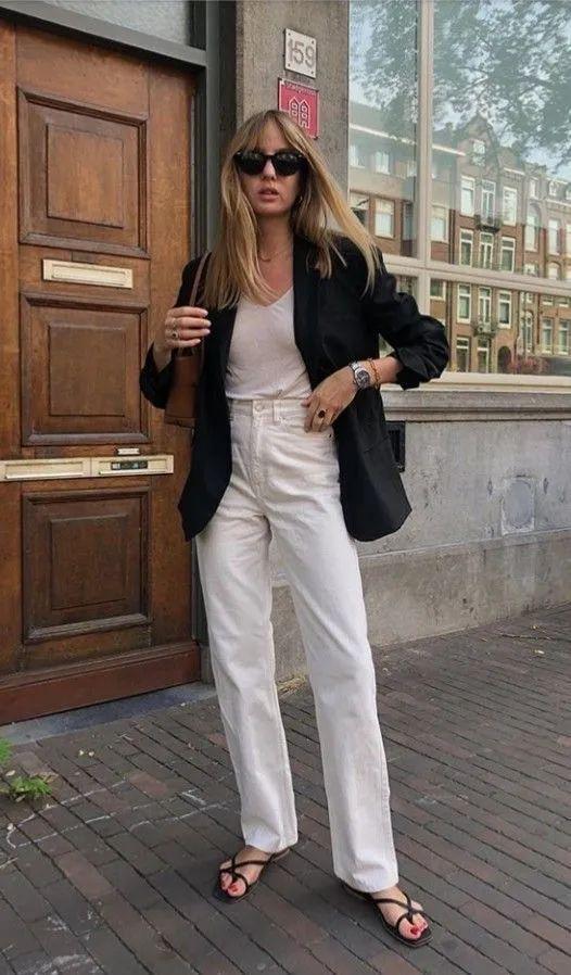 早晚溫度有些冷,也可以選擇一件黑色的外套,搭配白色長褲,內搭選件背心,這樣的組合也是很不錯的。時尚簡單又耐看。