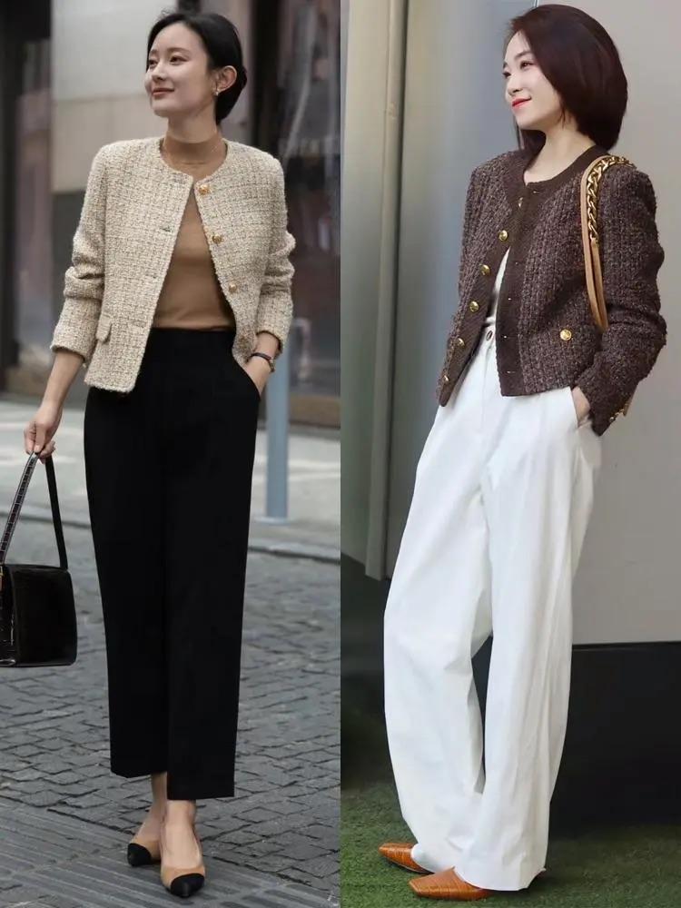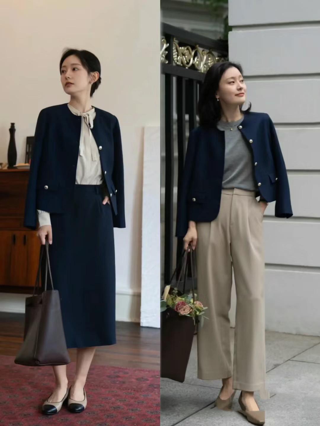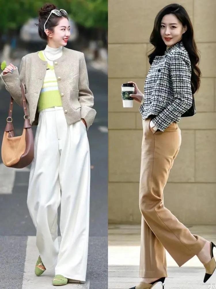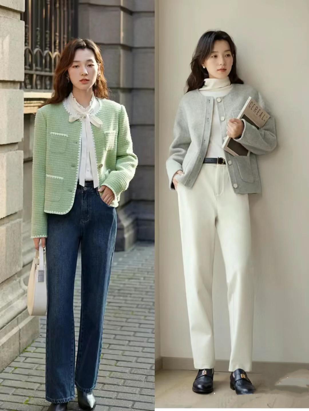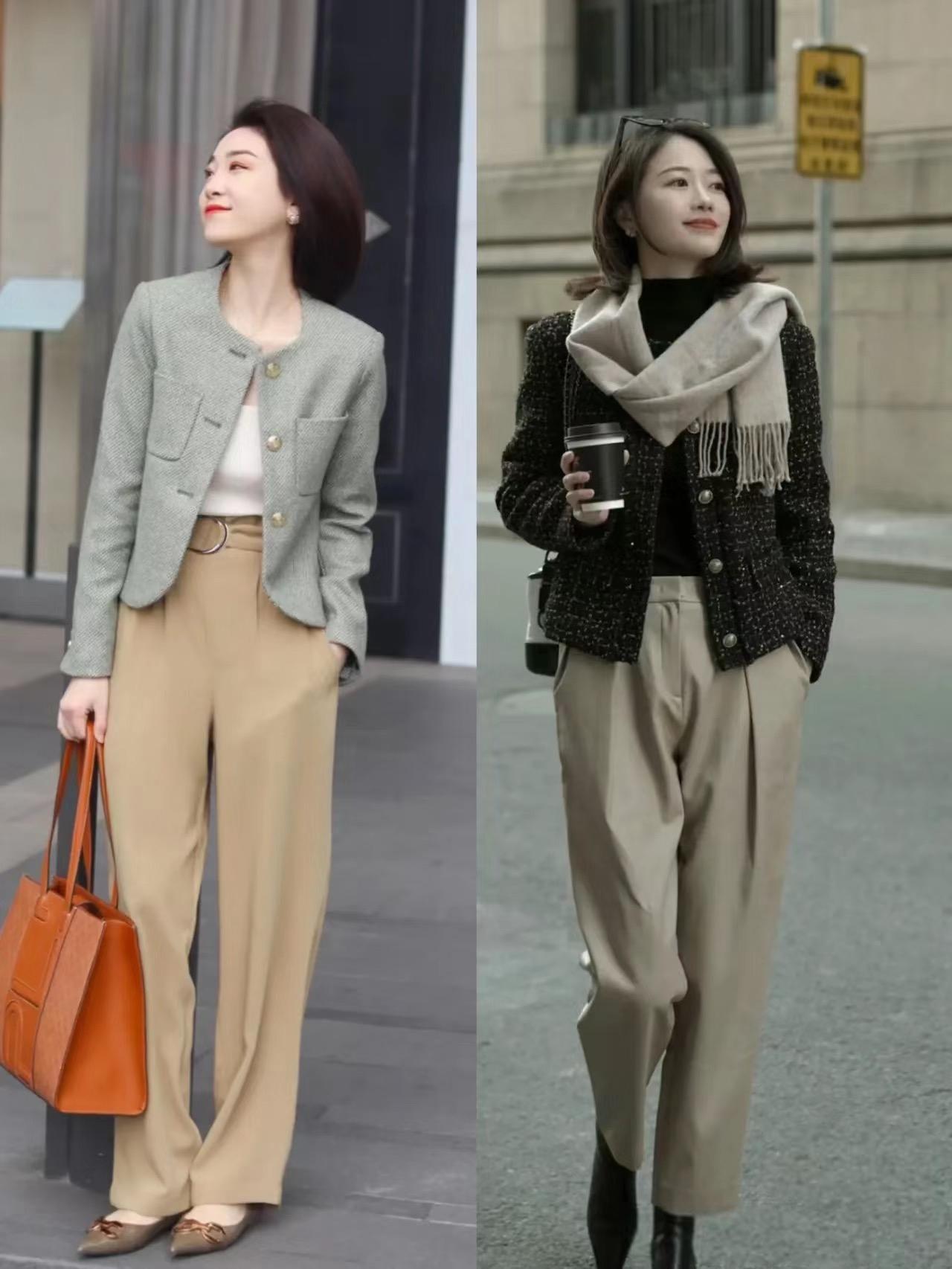 我們用小香風外套來搭配褲裝,建議大家選擇包容性更強的款式。儘量避開緊身褲、小腳褲等褲型設計。可以搭配直筒褲、闊腿褲、微喇褲、錐形褲等款式。