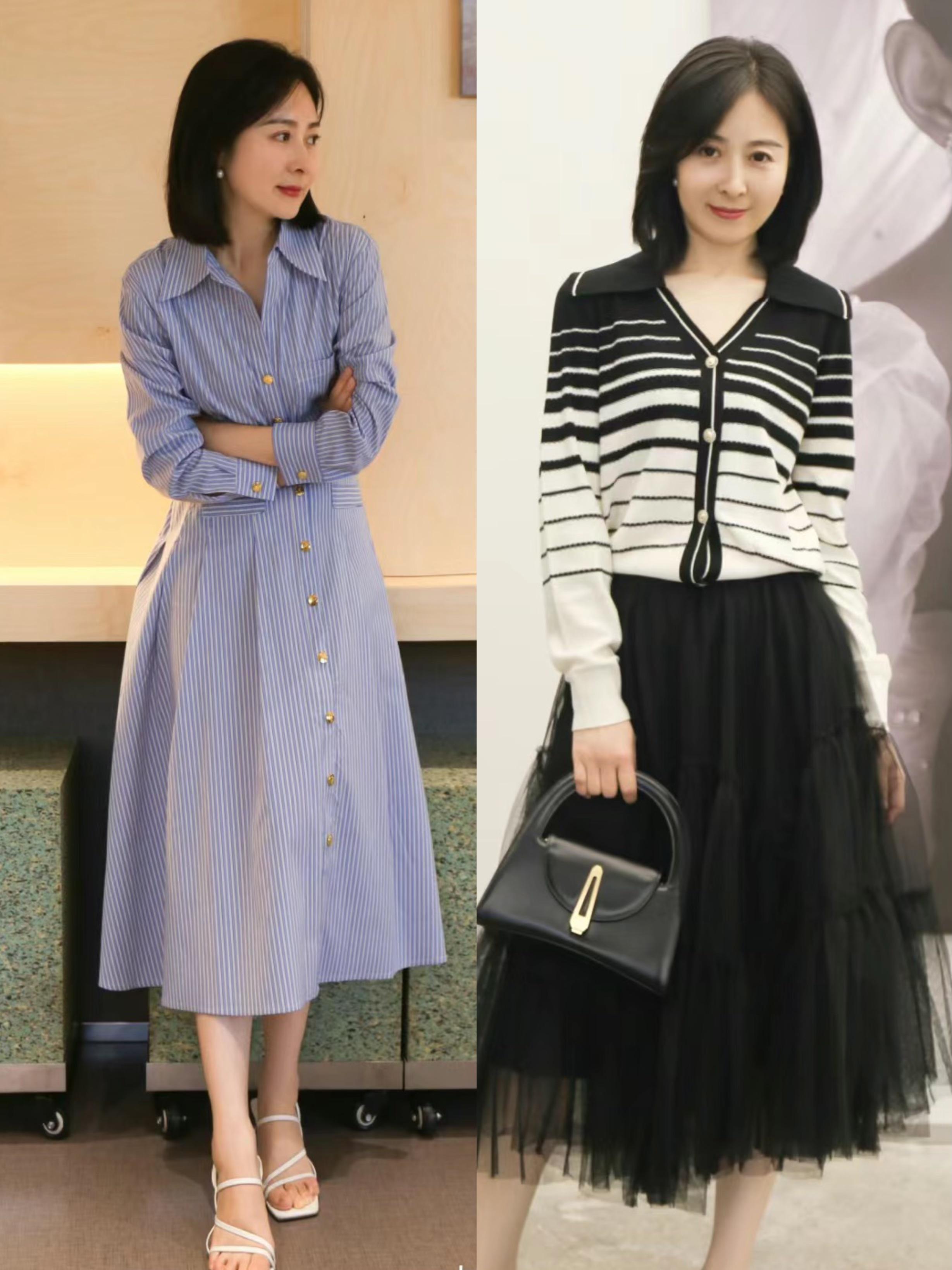 隨着天氣的轉暖,各種時髦大方的裙裝也會越來越受歡迎。像這種條紋襯衫裙,會有一種更加清新時尚的美。