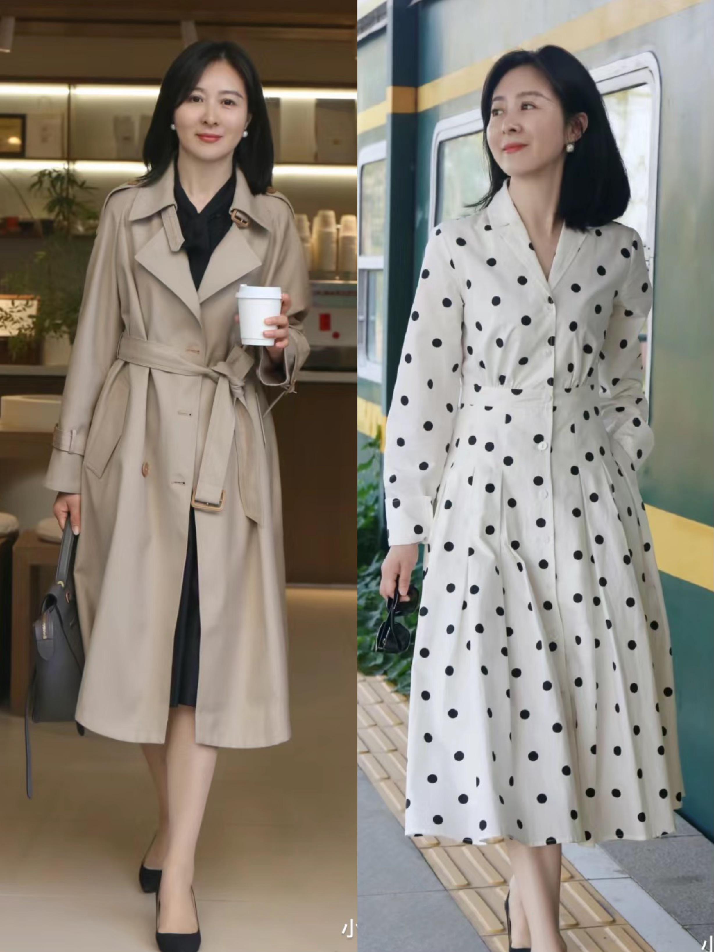 主要是黑色襯衫裙與黑色尖頭高跟鞋,形成了色彩上的呼應,氣質更加出衆。卡其色風衣選擇一種繫帶不繫扣的方式,隨性自然又很大方,春天裏的卡其色風衣也很百搭顯氣質。