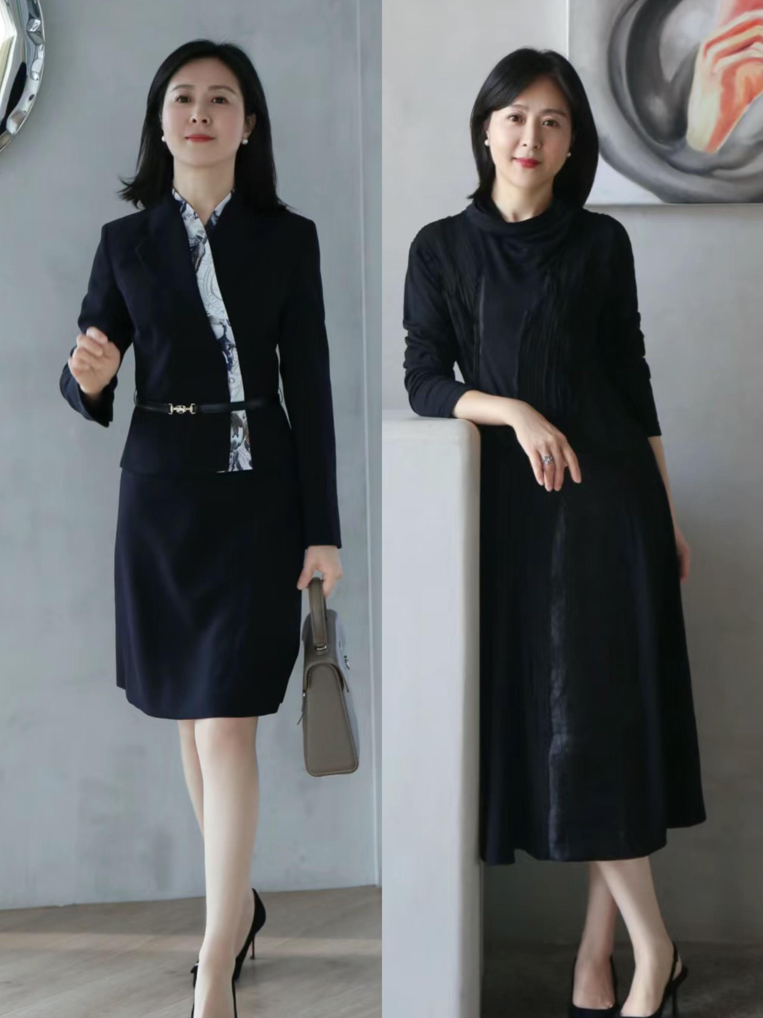 比如修身的西服套裙、或者經典的黑色連衣裙,都是一種衣服整套穿的形式。這種黑色系套裝,我們可以搭配黑色尖頭高跟鞋,修飾腿型又更提氣場。