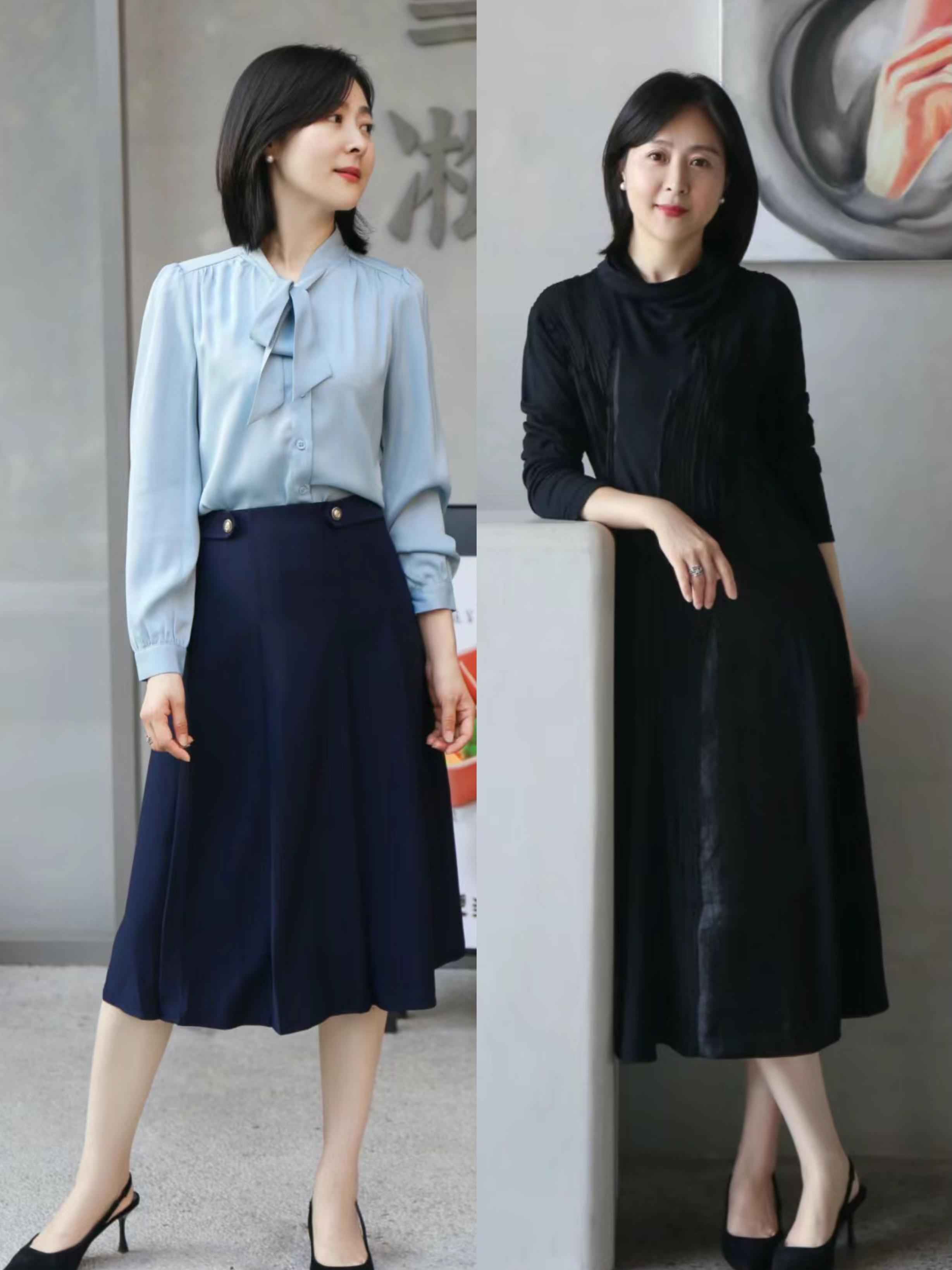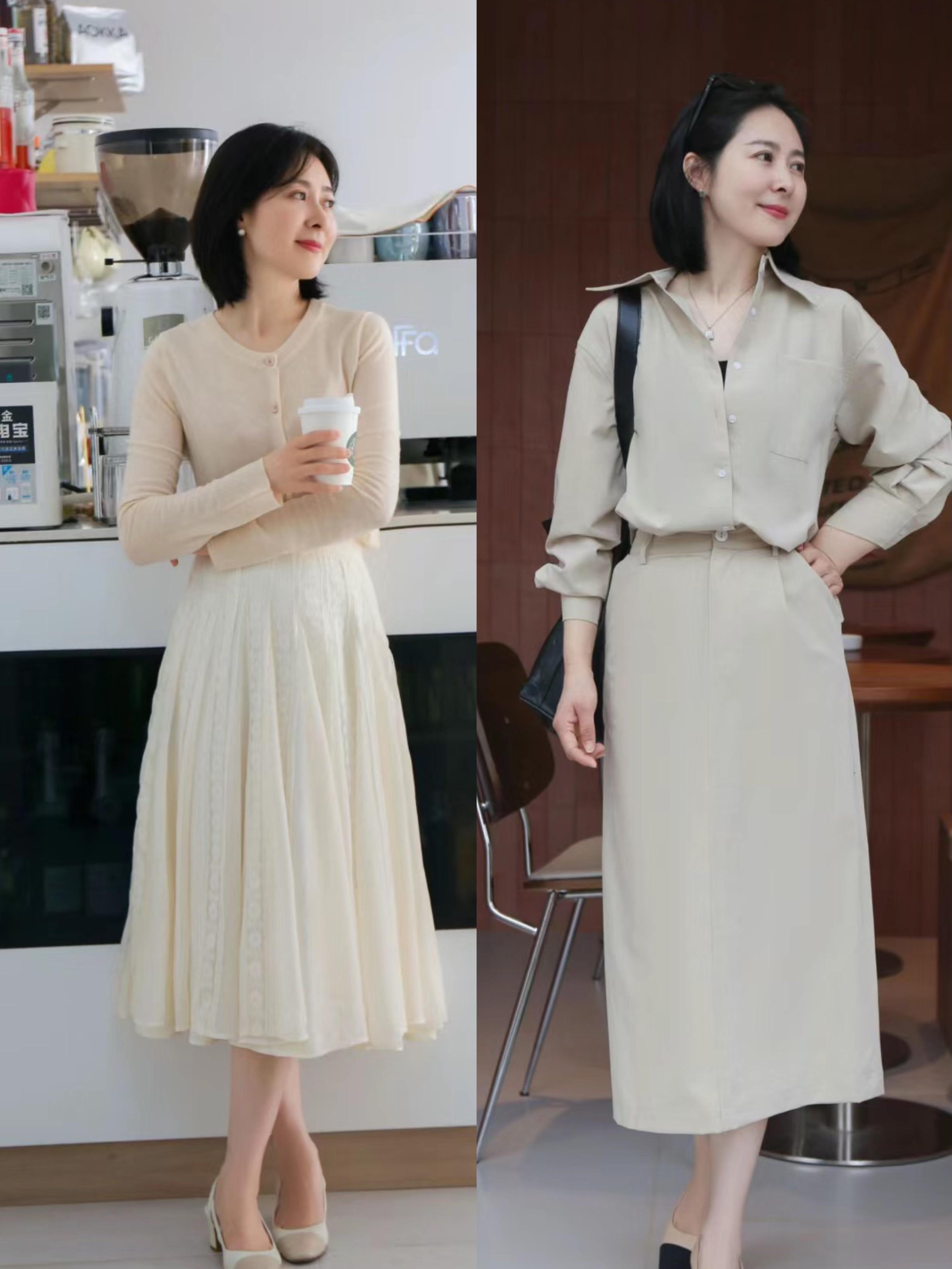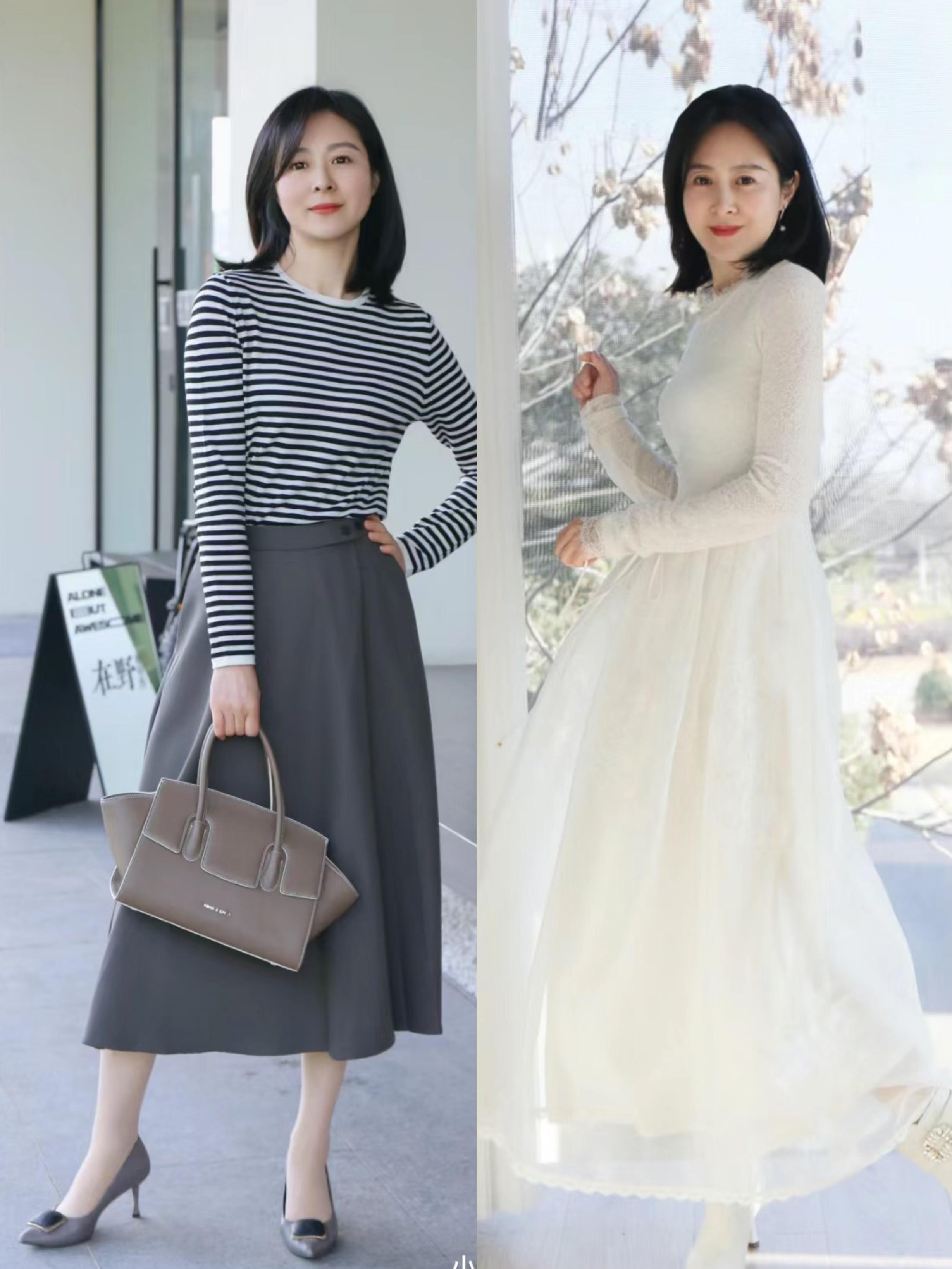 四五十歲的中年女人,可以是溫柔的、也可以是嫺靜的。比如穿米杏色的連衣裙,基礎款極簡風的設計,更突顯氣質品味。