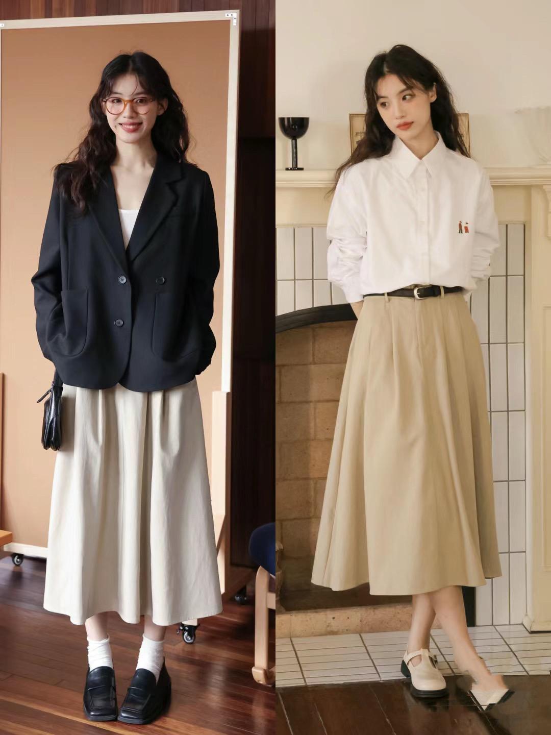 文藝清冷範的穿搭,也可以透着知識分子風的儒雅。像這種西服外套+淺卡其色半身裙的搭配,就有一種文化人的素雅精緻。