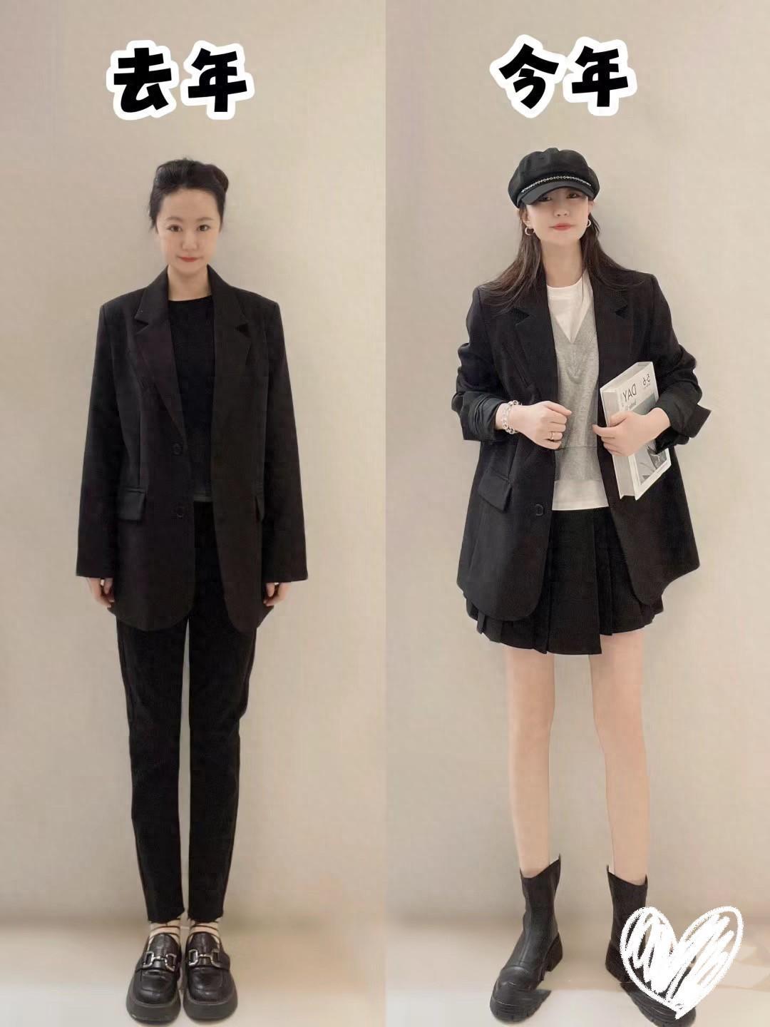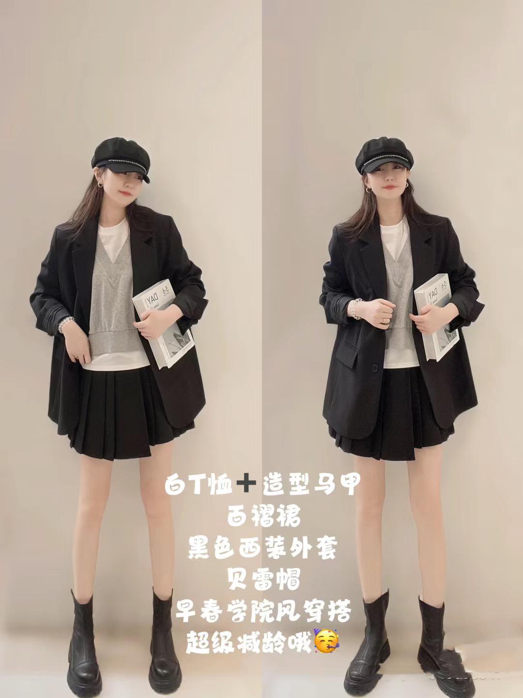 用寬鬆的黑色西服,搭配黑色百褶半身裙,有一種更加文藝清新的美。這種黑色百褶半身裙,遮胯顯瘦,露出雙腿線條、也是格外的俏皮洋氣。
