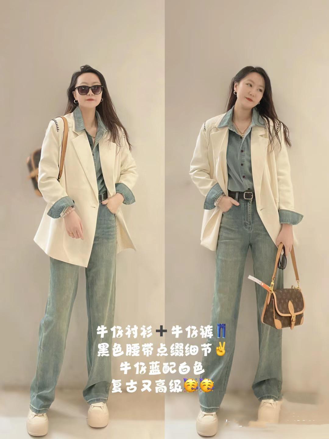 復古藍的牛仔襯衫+高腰直筒牛仔褲,很顯白又有腔調感。牛仔襯衫疊搭西服外套的時候,儘量把領口、袖口的位置翻出來,豐富層次感更洋氣。