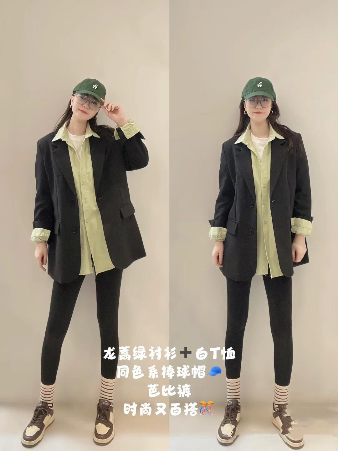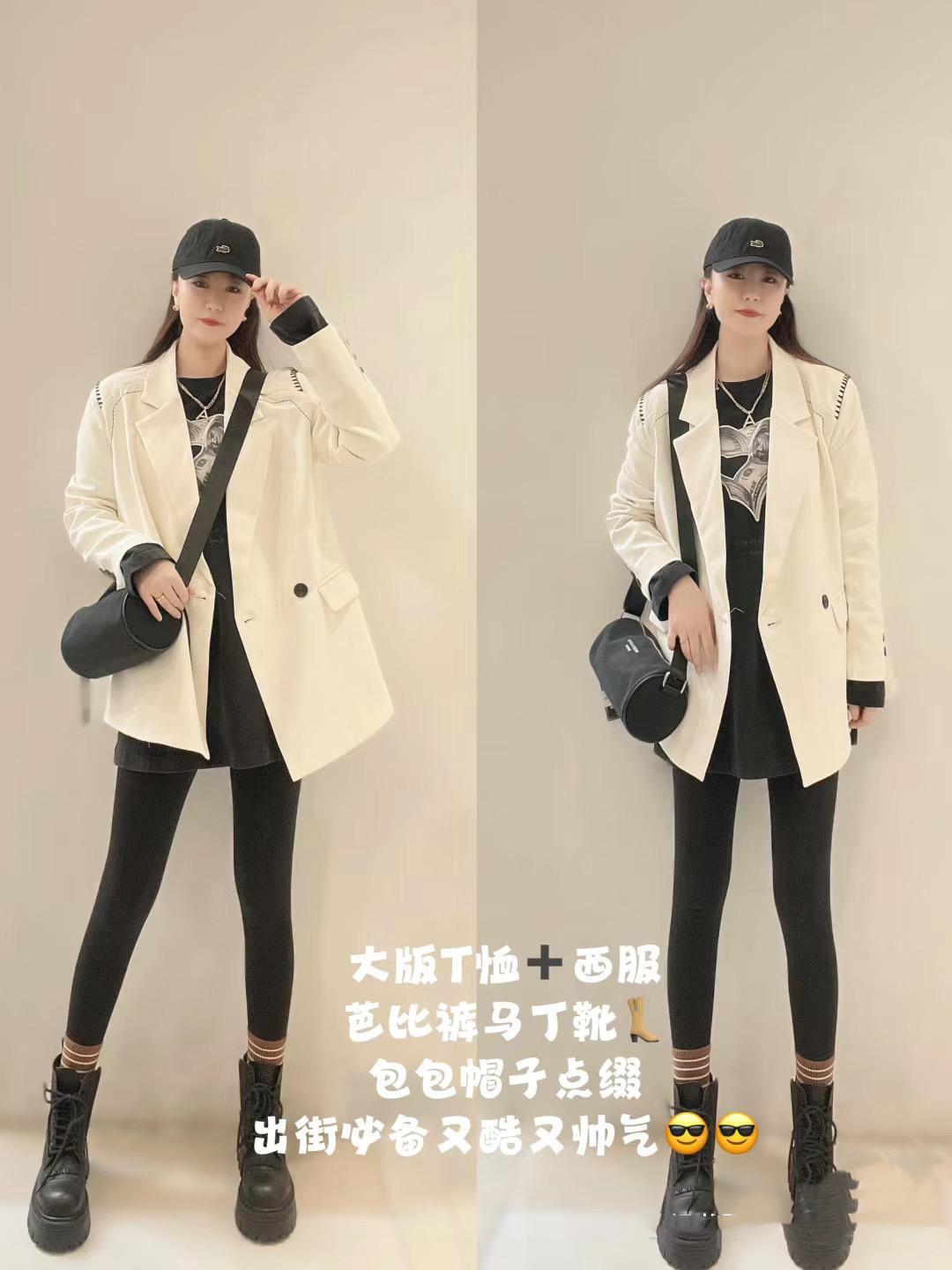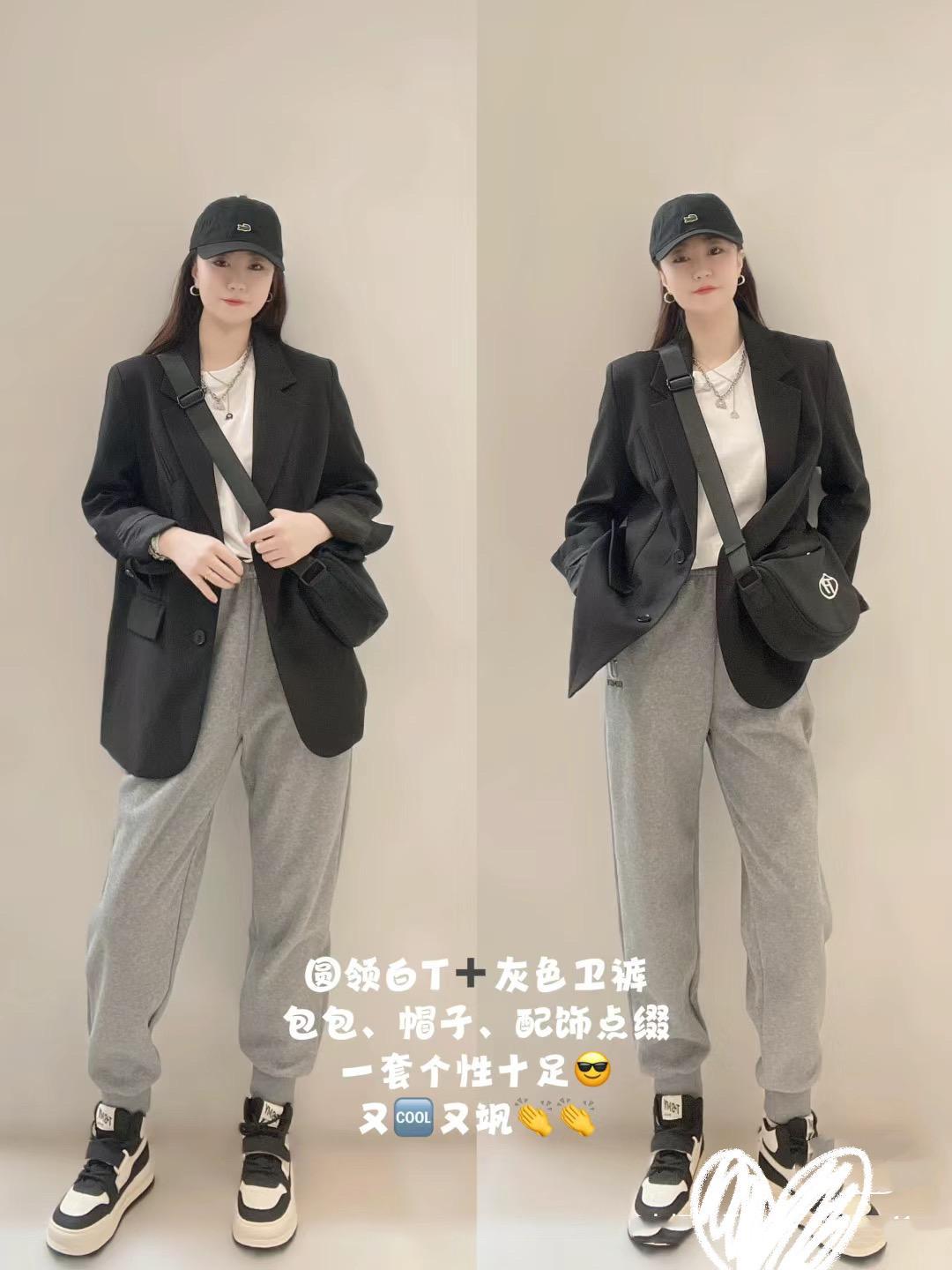 寬鬆的西服外套,疊搭白色T恤,給人一種高級乾淨的美。下身配一條束腳的灰色衛褲、簡單隨性的搭配又酷又颯,配厚底的撞色鞋子、依然是顯高又洋氣。
