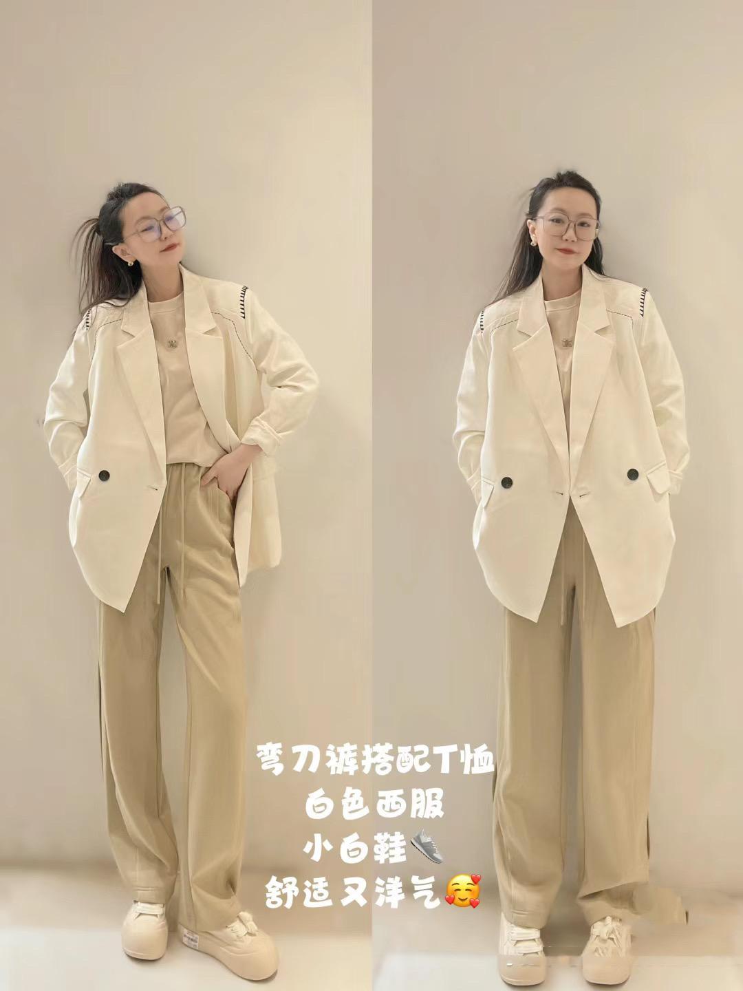 用寬鬆的白色西服,來搭配同色系的T恤,會有一種大方優雅的力量。高腰的彎刀褲配上一雙厚底小白鞋,讓白色西服外套的穿搭變得舒適又洋氣。