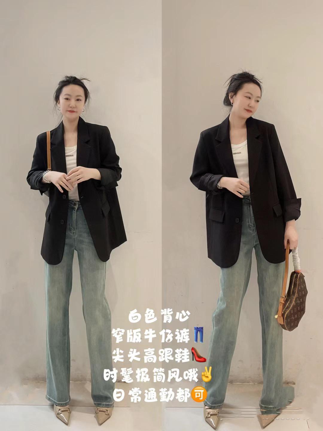 用寬鬆的西服外套搭配修身的白色背心,外鬆內緊的搭配格外顯瘦。高腰牛仔褲配尖頭高跟鞋,時髦又顯腿長,這樣的穿搭日常通勤都合適。