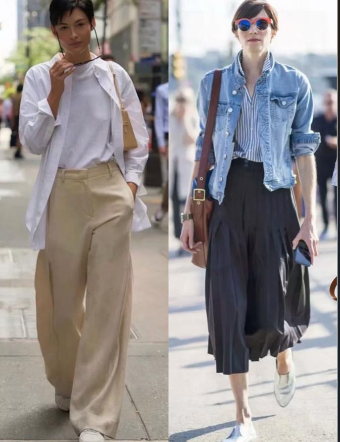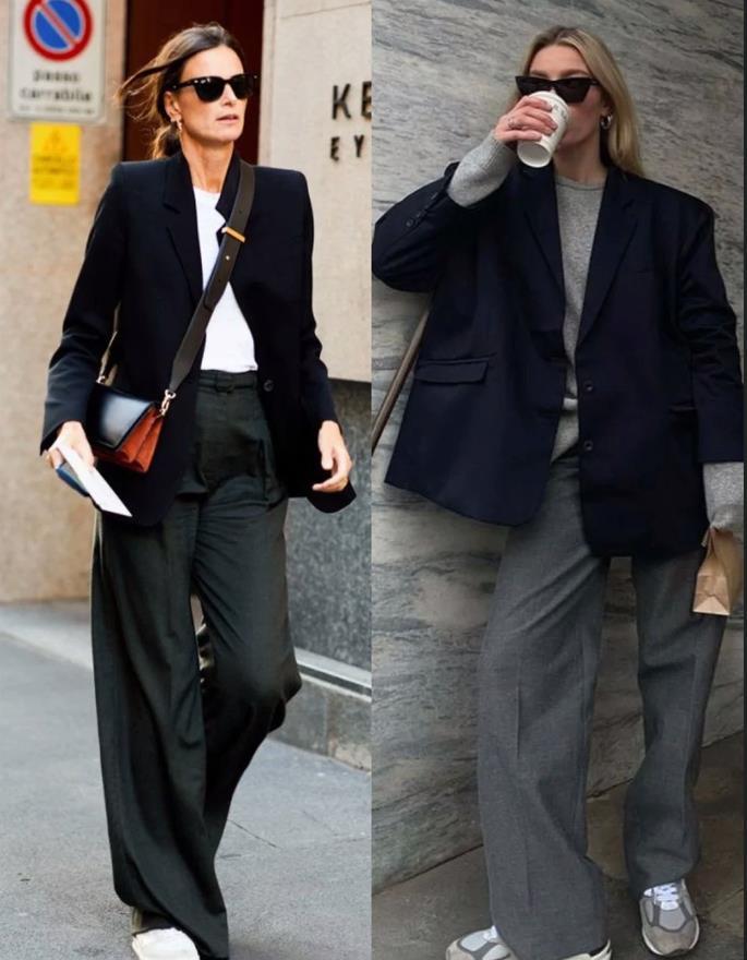 除了牛仔拖地褲之外,西裝款式的拖地褲也很值得你嘗試,舒適透氣的面料,加上寬鬆的版型,顯瘦藏肉效果絕了。搭配西裝外套來配,職場通勤的風範就打造。