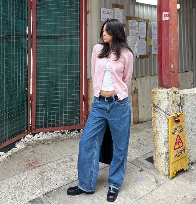 有點粉嫩的穿搭,淺淺的低飽和度粉色針織開衫,穿起來完全沒有顯俗氣的,可以單穿,也可以在裏面增加一件小背心。下裝搭配一條牛仔褲,最日常時髦了。