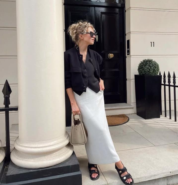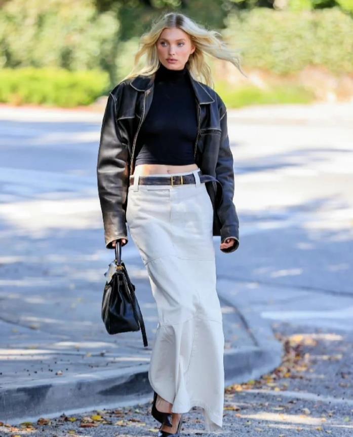 自古以來,黑白配都是最佳的cp,在春天,可以選擇外套+半身長裙的組合,好看時髦又保證了一點溫度。皮質黑色外套+白色牛仔半身直筒長裙,利用腰帶進行點綴,強調了腰線比例,又瘦身。