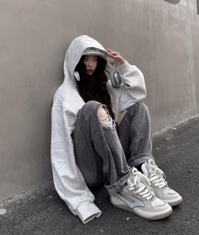 穿不膩的灰色系,誰懂?這一套無性別風的搭配,男女都可以參考起來,淺灰色連帽衛衣+牛仔褲+運動鞋,一下子就打造了美式復古街頭風。
