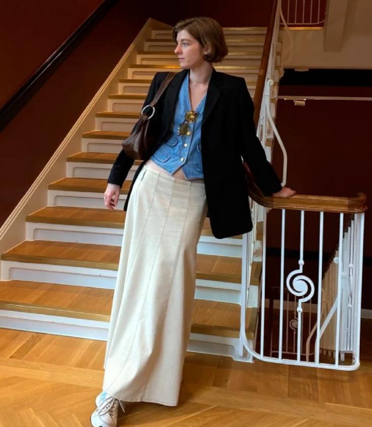 西裝外套+半身直筒長裙+運動鞋,適合職場通勤,也適合日常休閒逛街,不管是哪一種場合,都能輕鬆展現出時髦大氣。
