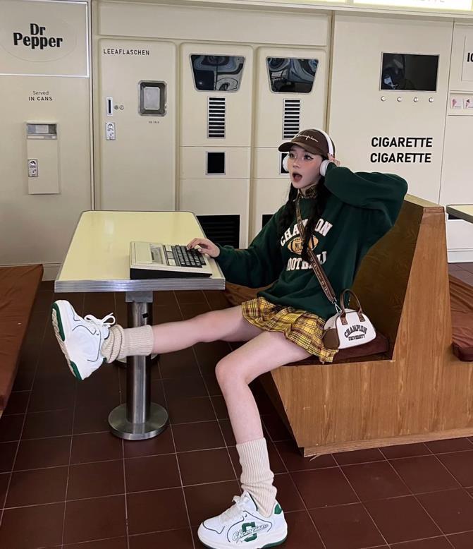 今年復古美高的穿搭真的很流行呢,喜歡這種風格的姐妹可以安排起來,灰色連帽衛衣+短裙,輕輕鬆鬆就能打造出青春感。
