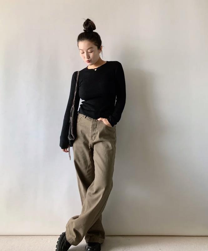 喜歡不露腿的穿搭,緊身短款小開衫搭配寬鬆的高腰拖地褲,誰懂啊,上選下長,上緊下松的結合,就是可以完美修飾整個身材比例。顯瘦顯腿長兩不誤!