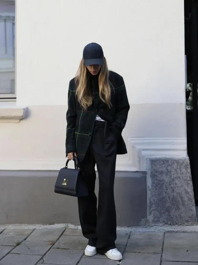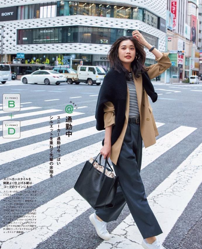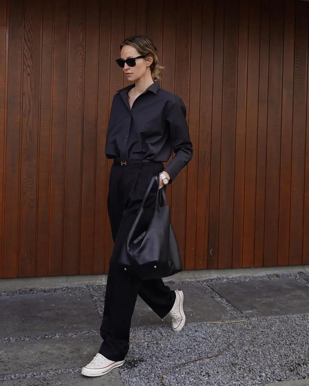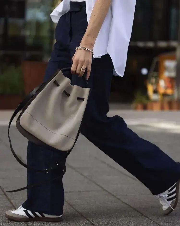 闊腿褲+小白鞋的搭配,也是時常能在時尚圈裏看到,將時尚和休閒的元素相結合,從而展現出別具一格的姿態。