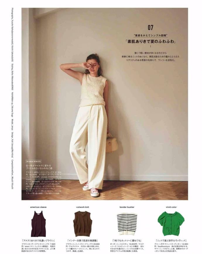 夏天也可以穿針織,像這種無袖針織衫就很清涼舒適,搭配西裝闊腿褲,褲子顏色和上衣很接近,同色系的搭配,往往是最能打造出高級感的,也減少出錯率。淺粉的平底帆布鞋,很好點亮了整個造型。