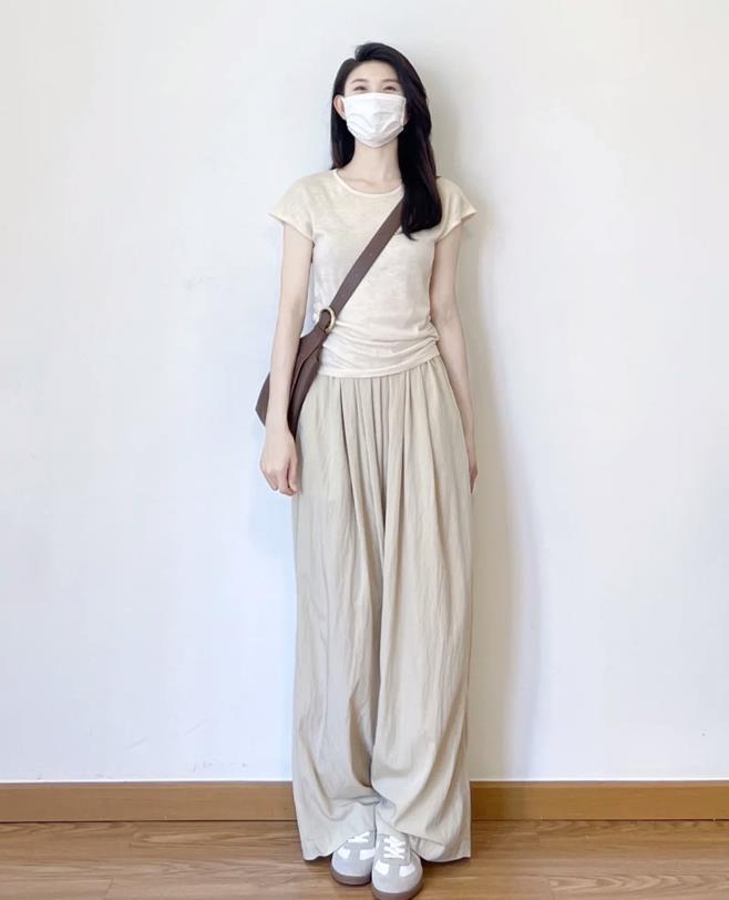 真的拒絕不了上短下長的穿法,這簡直是150+小個子女生的最佳搭配,上身比例好的身材,建議選短款修身的t恤來穿,搭配起寬鬆的闊腿長褲和平底鞋,休閒舒適又不失隨性。