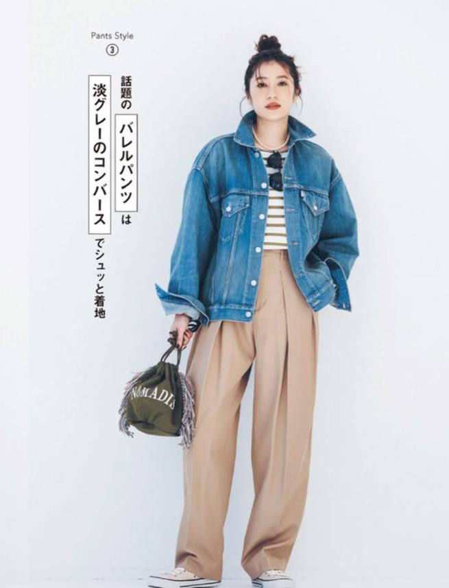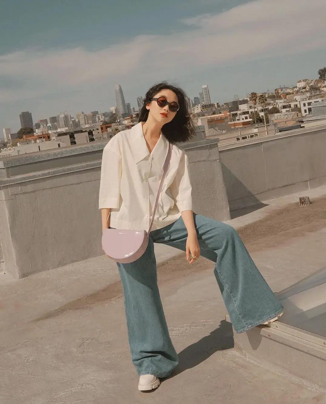鬆緊結合的穿搭,是最適合梨形身材的姐妹,上衣選擇一件修身的正肩t恤來穿,很好修飾了整個身材比例。搭配闊腿牛仔褲真的絕了,寬鬆的褲型,正好可以遮掩住腿部的缺點。