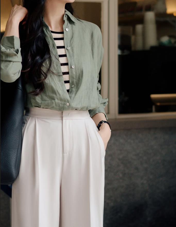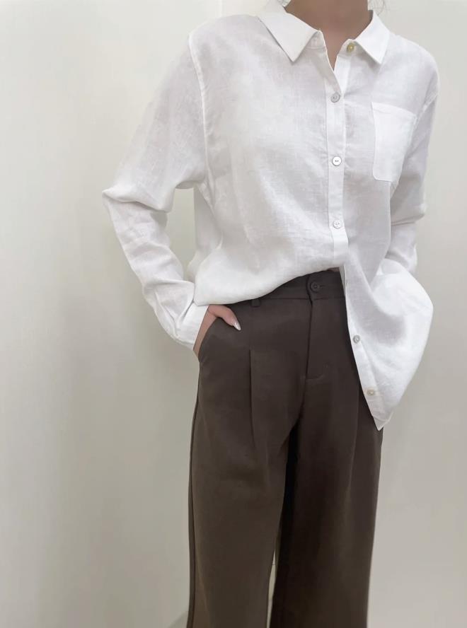 鹽系少年感的穿搭,看起來真的很不錯,乾淨簡潔的白色襯衣,面料很輕薄透氣,適合在悶熱的夏季穿。搭配棕色闊腿褲和平底鞋,可職場通勤,也可以休閒逛街。