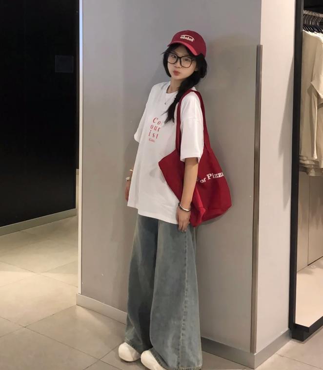 白色短袖t恤和牛仔闊腿褲的組合,好好看啊,垂墜感十足的牛仔闊腿褲,是任何一種身材都能駕馭的,胖瘦解開。與乾淨白色t相配,利用棒球帽和同色包包點綴,青春活力又吸睛。